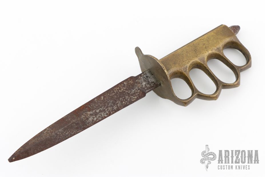 Extremely hard to find good examples. This is a WWI trench knife made by Au Lion, a French firm that helped to supplement the supply needed. Cast Brass handle with U.S. 1918 stamped. The blade is double edged, .204" blade stock and 1.022" blade depth, hidden tang construction. Has rust/oxidation on the blade, some dings on the handle, otherwise good condition for its age.