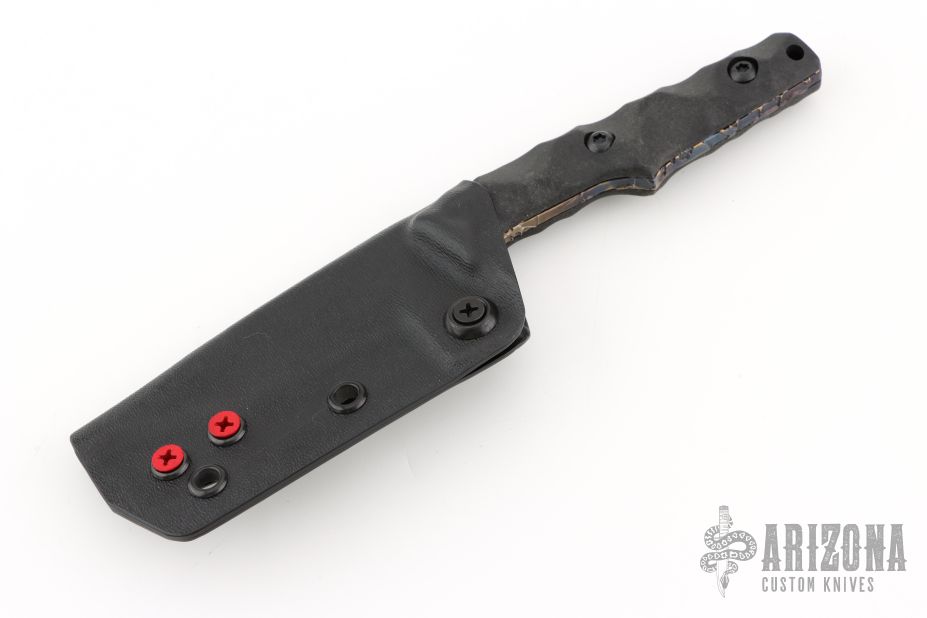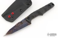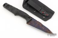 This Thick Huginn EDC by Bawidamann Blades was named after Odin’s Raven. It features an acid etched Black Pearl patina finished blade with notched thumbrest and sharpened top edge, .158" blade stock and 1.185" blade depth, full tang construction. The handle has IM Bawidamann Chunked Pattern Carbon Fiber scales (proprietary Carbon fiber composite). Comes ready to carry with the Bawidamann Uberscabbard. New from maker.