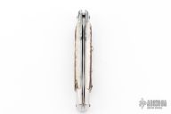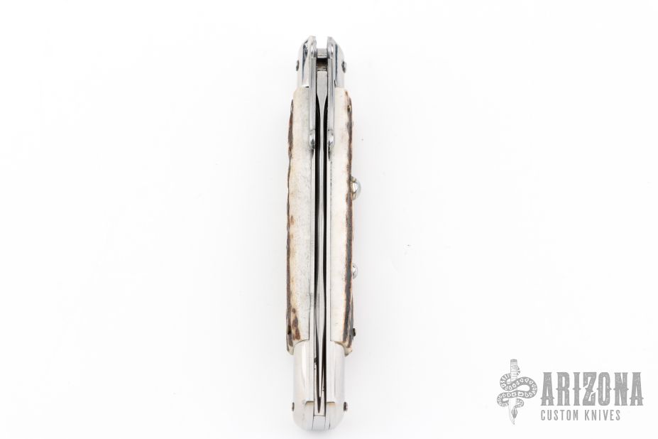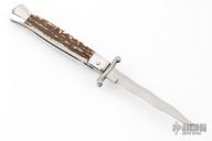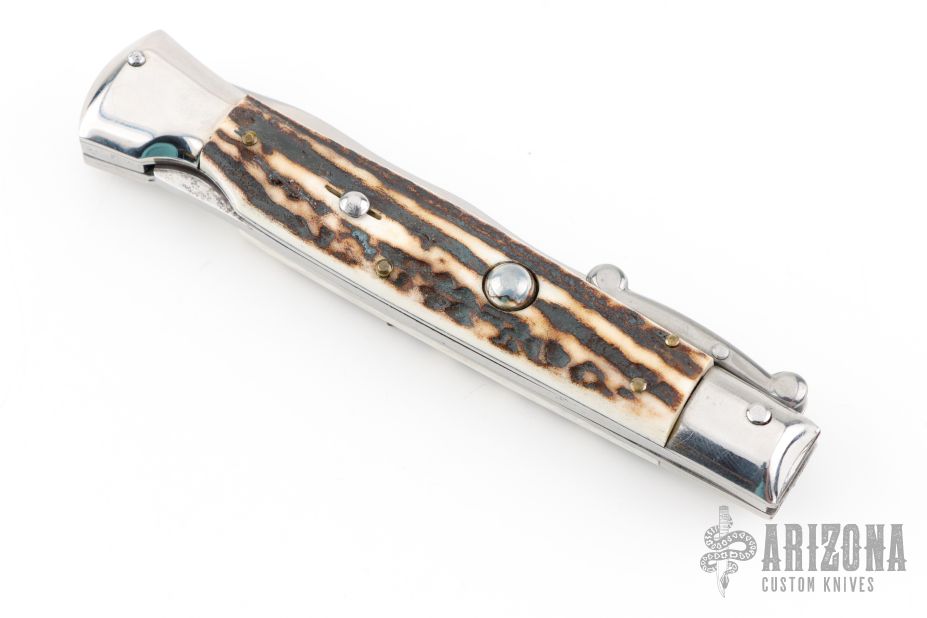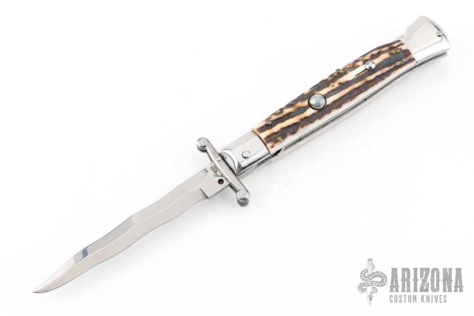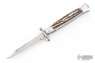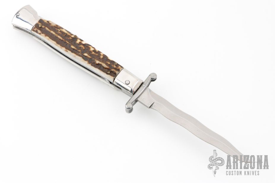 This Swing Guard Lockback Auto has a stonewashed stainless steel Kris blade with false top edge. Handle is stag with stainless steel bolsters and liners, and stainless steel spring. Has safety. Excellent Condition.