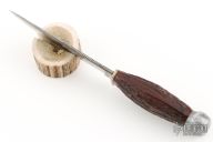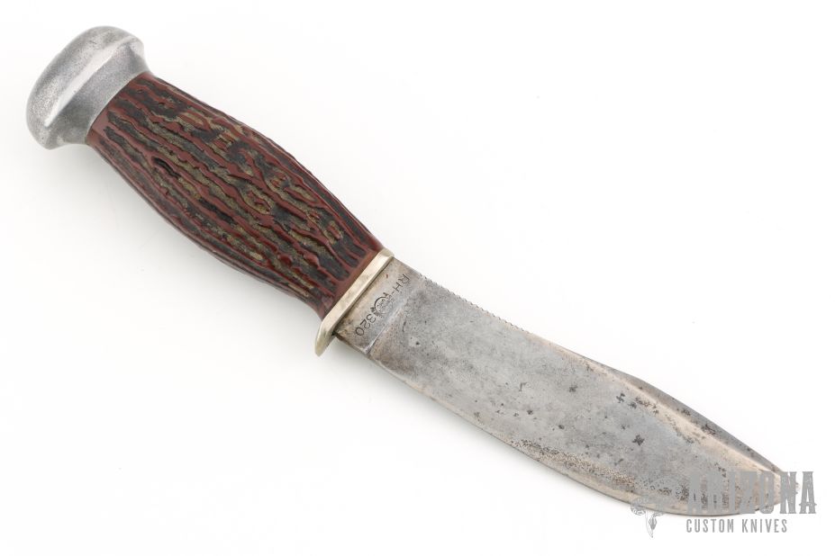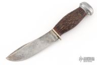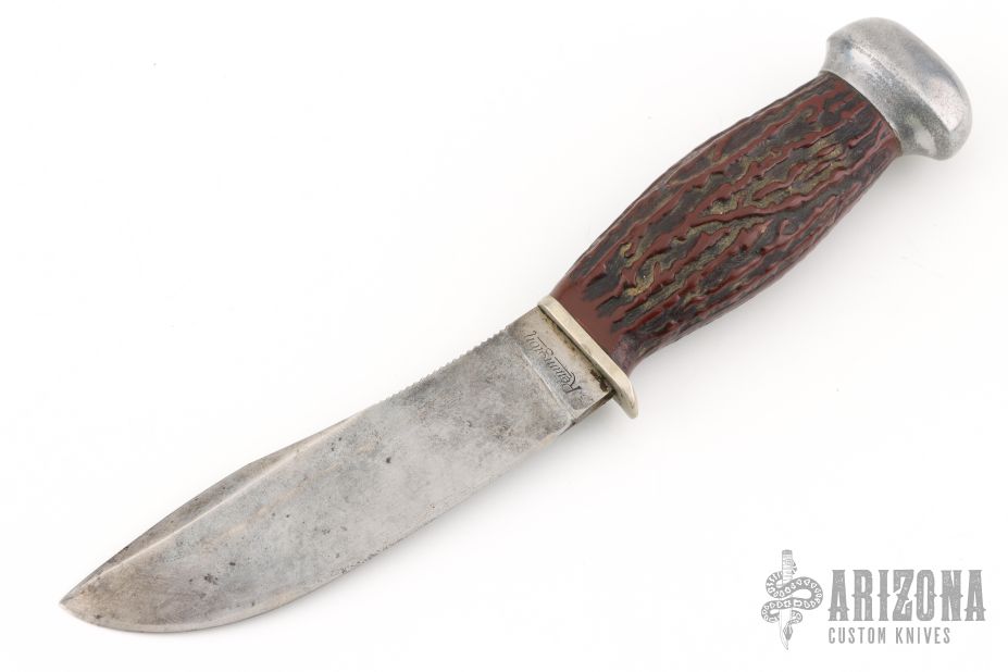 This knife by Remington features a satin finished upswept blade with notched thumbrest, .145" blade stock, 1.180" blade depth, hidden tang construction.  The handle features a nickel silver guard and aluminum butt complimented by a faux stag grip.  Includes a zippered case.  Has some scratches and patina, otherwise good condition for its age.