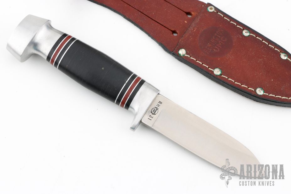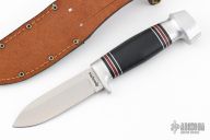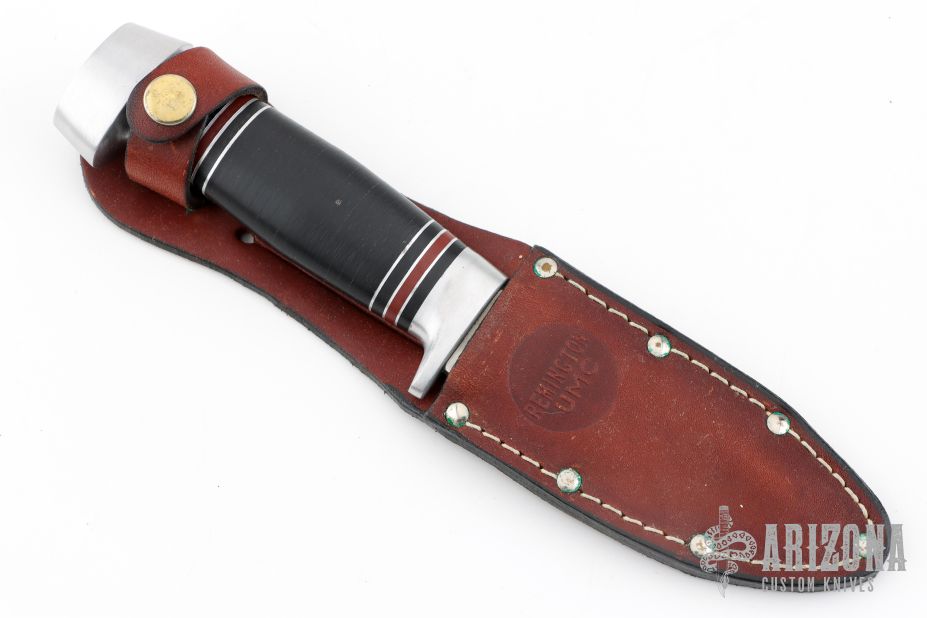 This knife by Remington features a satin finished drop point blade with a hidden tang construction.  .133" Blade Stock.  1.013" Blade Depth.  The handle features an aluminum guard and butt with a stacked black micarta grip.  Includes original box, papers and brown leather sheath. Excellent Condition.