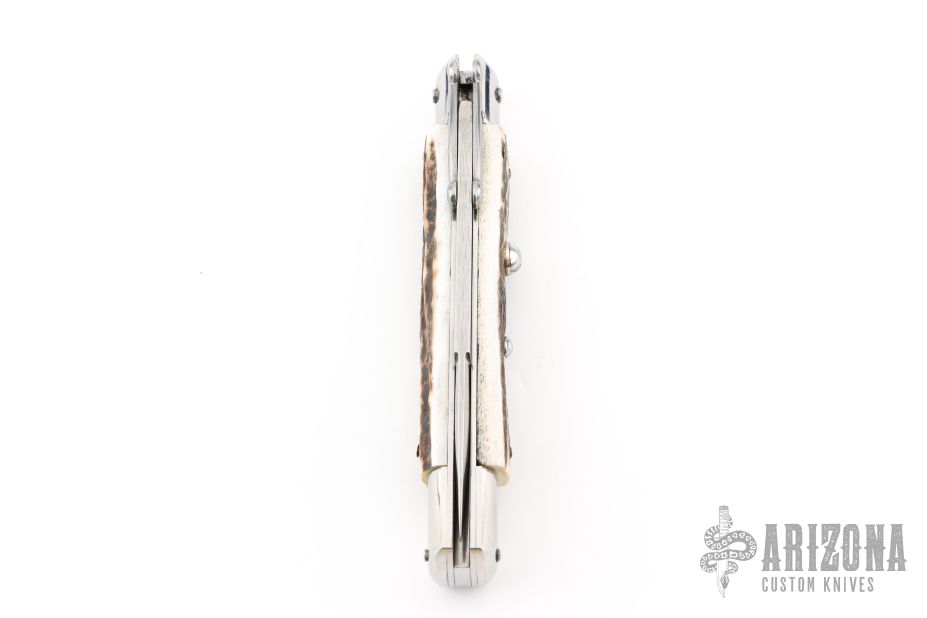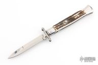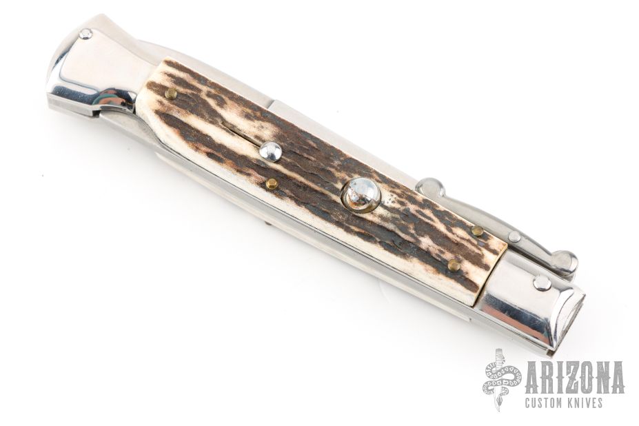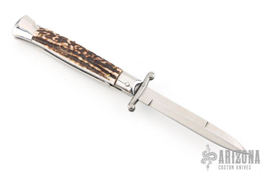 This Swing Guard Lockback Auto has a stonewashed stainless steel spear point blade with false top edge. The handle is stag with stainless steel bolsters and liners, and stainless steel spring. Has safety. Excellent Condition.