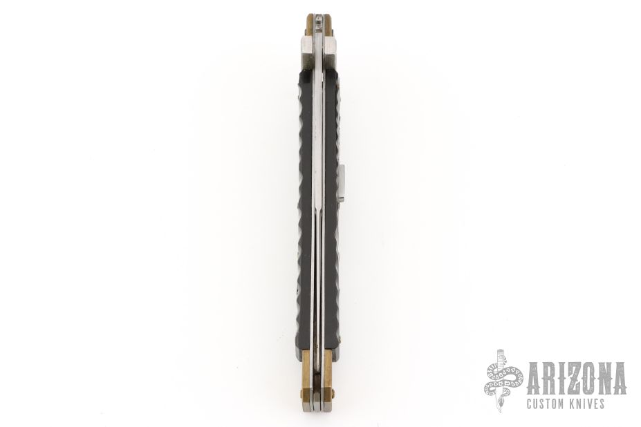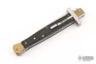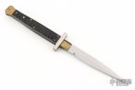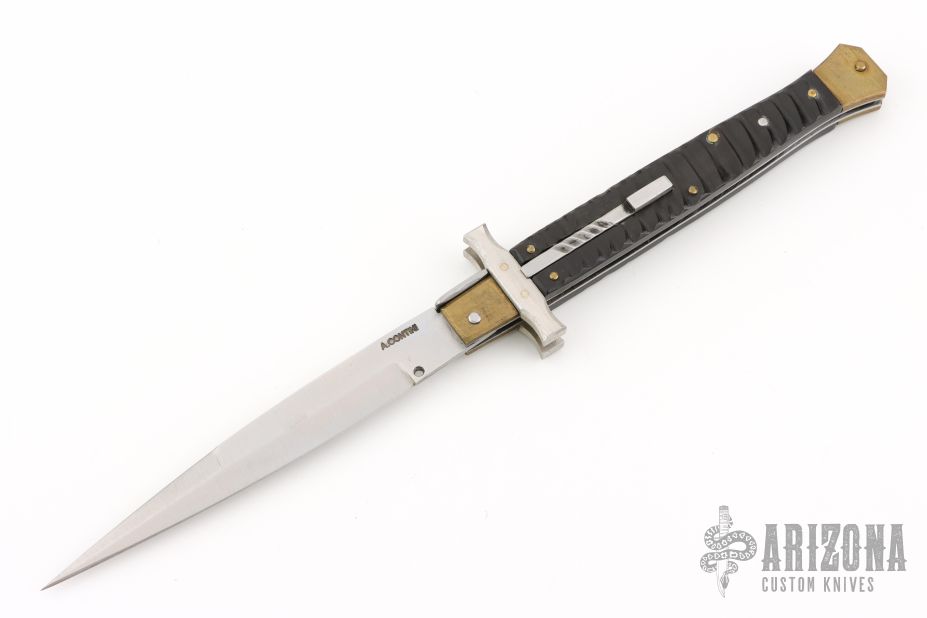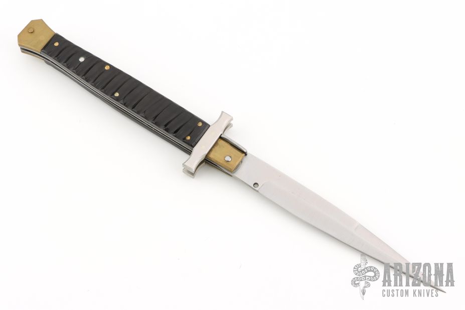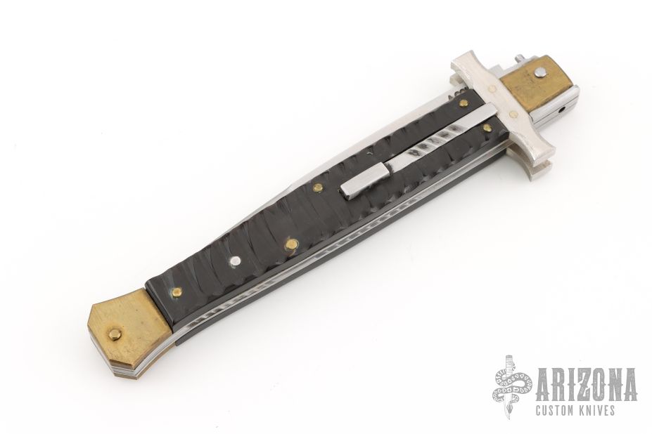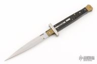 This Swing Guard Picklock Auto by Antonio Contini features a satin finished blade with false top edge. The handle has stainless steel guard, brass bolsters, stainless steel liners, fileworked stainless steel backspacer, buffalo horn scales. This one has a rolling safety on the spine of the handle. Nice action. Comes with a box. Excellent condition.