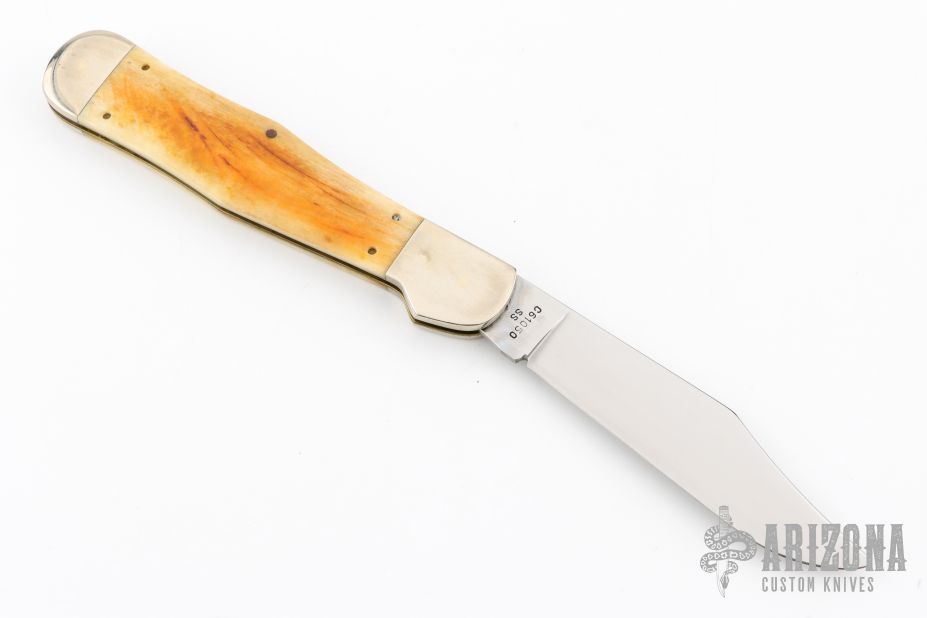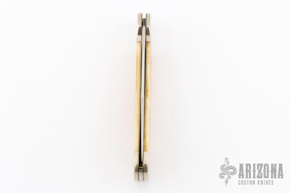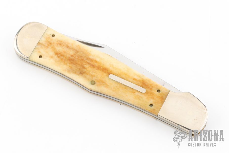 This Coke bottle folder by Case knives has a mirror polished blade with nail nick. The handle has nickel silver double bolsters, bone covers, brass liners, steel spring. Has half stop. Has some light scratches otherwise excellent condition. Dated 1997 (i think)