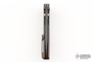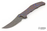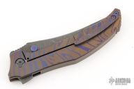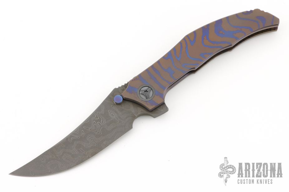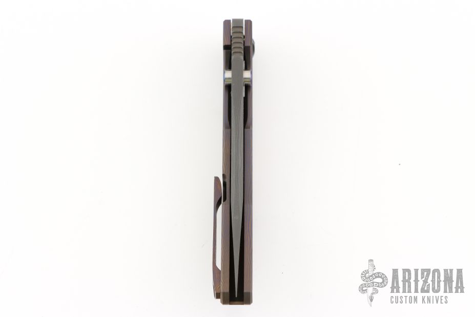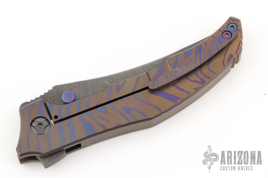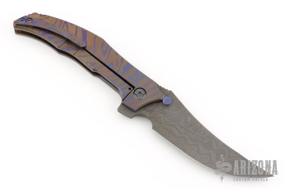 This Persian Integral by Peter Rassenti features a Damasucs blade with notched thumbrest, dual anodized thumbstuds and flipper. The handle a bead blasted integral MokuTi frame with zirconium pivot collar, matching mokuti pocket clip is positioned for right hand, tip up carry. Includes original box. Excellent condition.