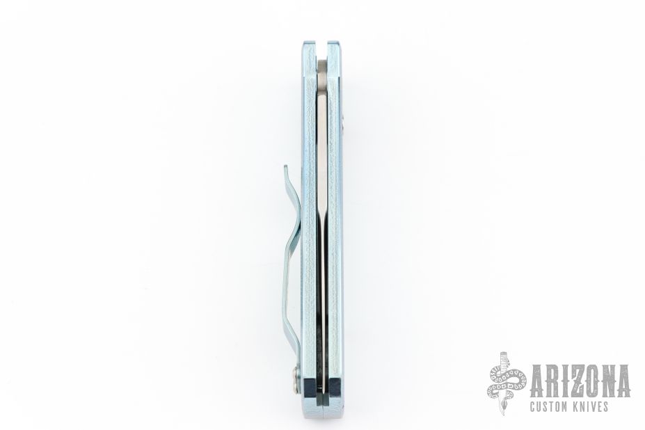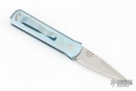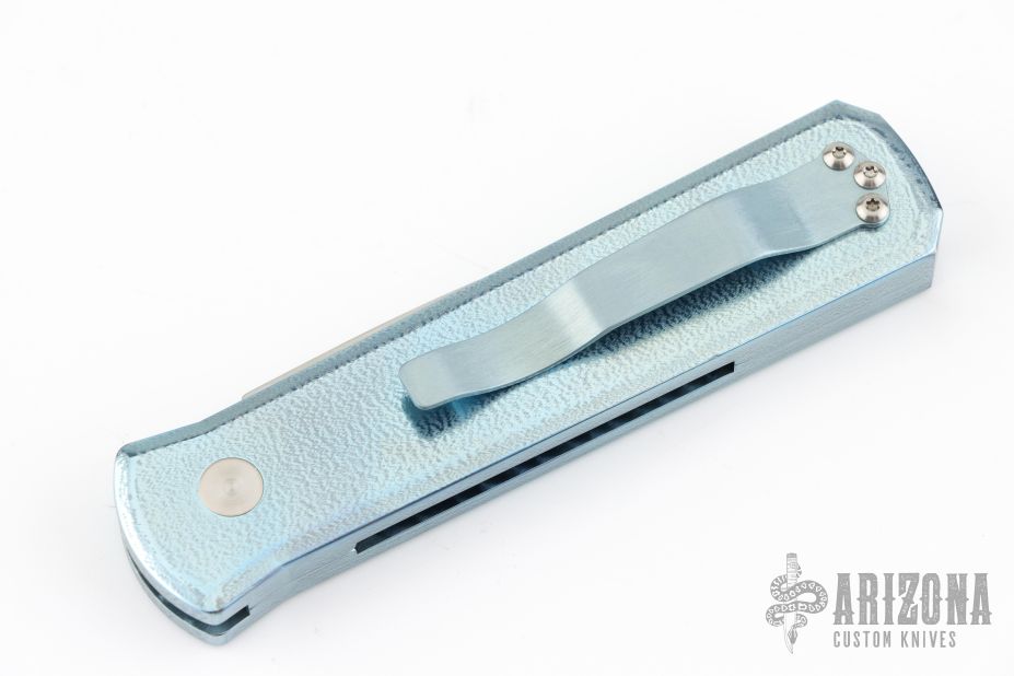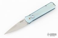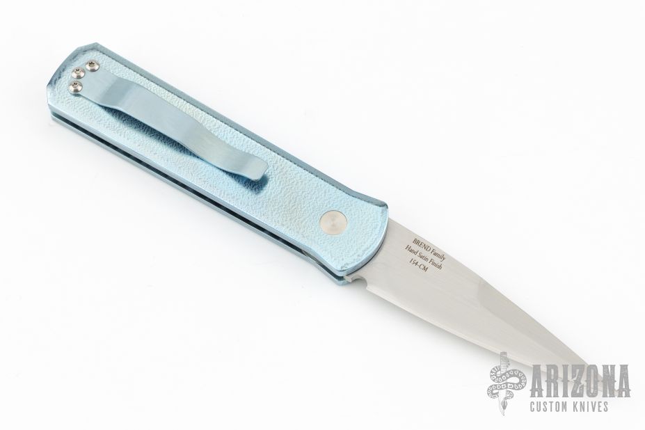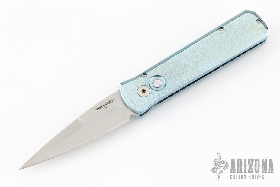 This Godson Custom features a hand rubbed satin finish spear point blade that was hand ground by the Brend family. The handle has an anodized titanium frame with a matching tip up pocket clip. Mother-of-Pearl inlaid into the push button.  Includes a padded zippered case.  Excellent Condition.