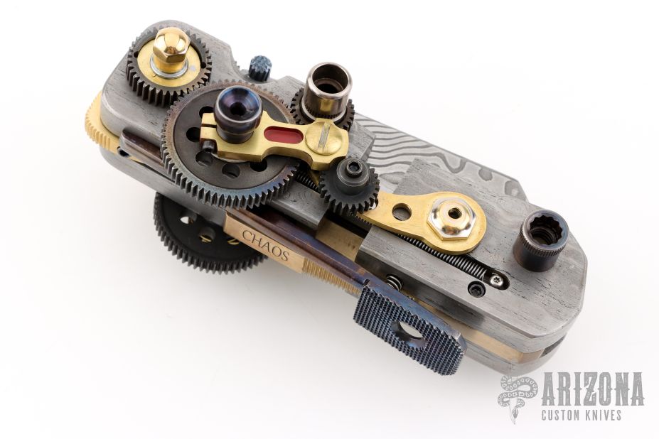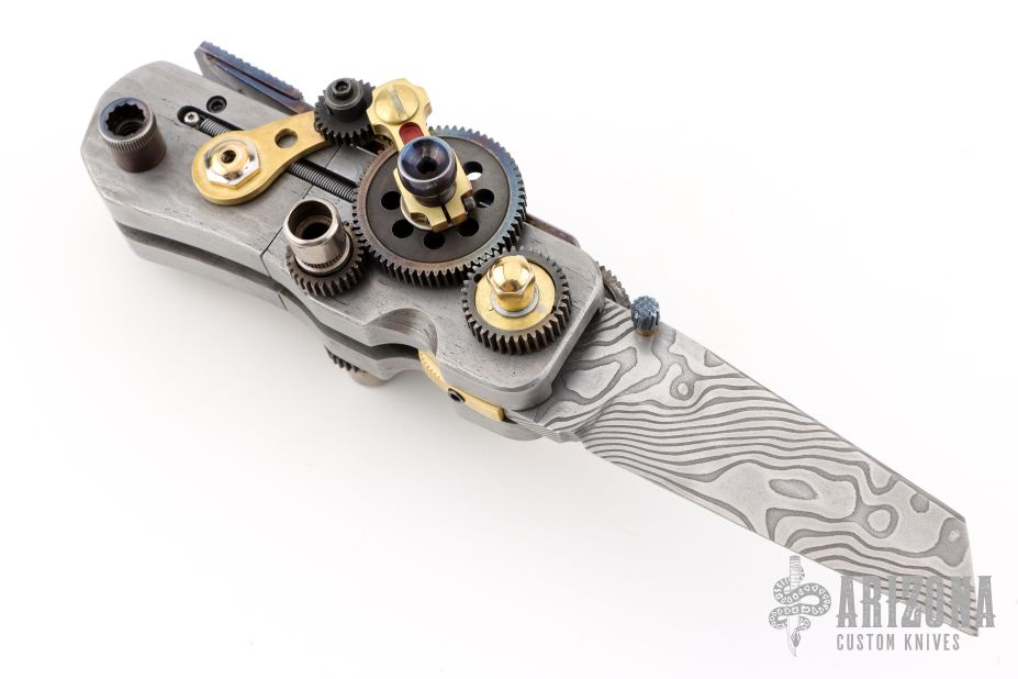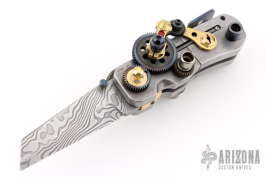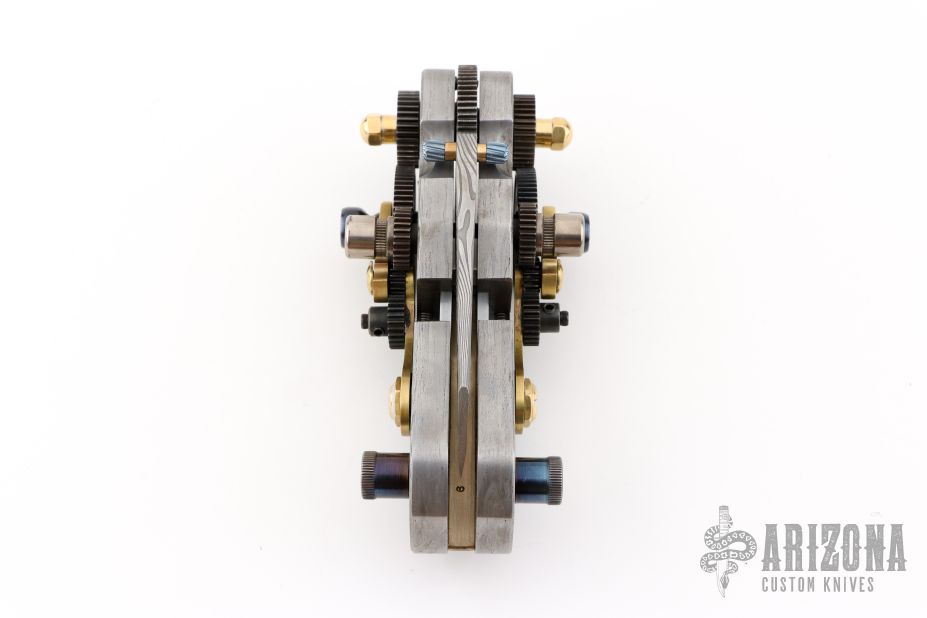 This is serial #9 of my Steampunk/Dieselpunk series. I's a one of a kind, expanding frame, back-lock folder, with eight steel gears that rotate with the knife's opening and closing. With 67 hand made parts, it took roughly 180 hours to construct and is well named... it was a difficult build.