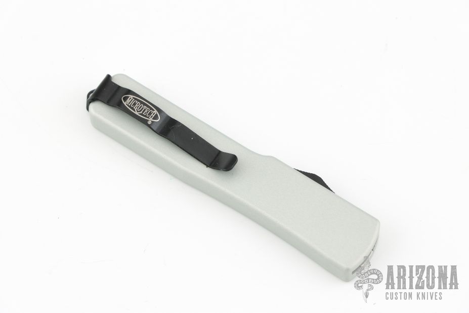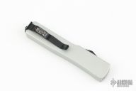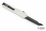 This UTX-70 OTF automatic features a black tanto edge blade with a standard edge and a white anodized aluminum handle with all black hardware. S/N 13157. Dated 08/2010. Comes with original box and papers. Excellent condition.