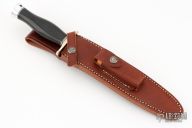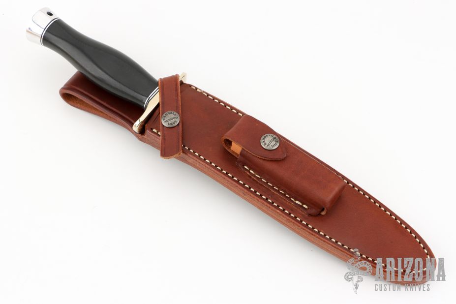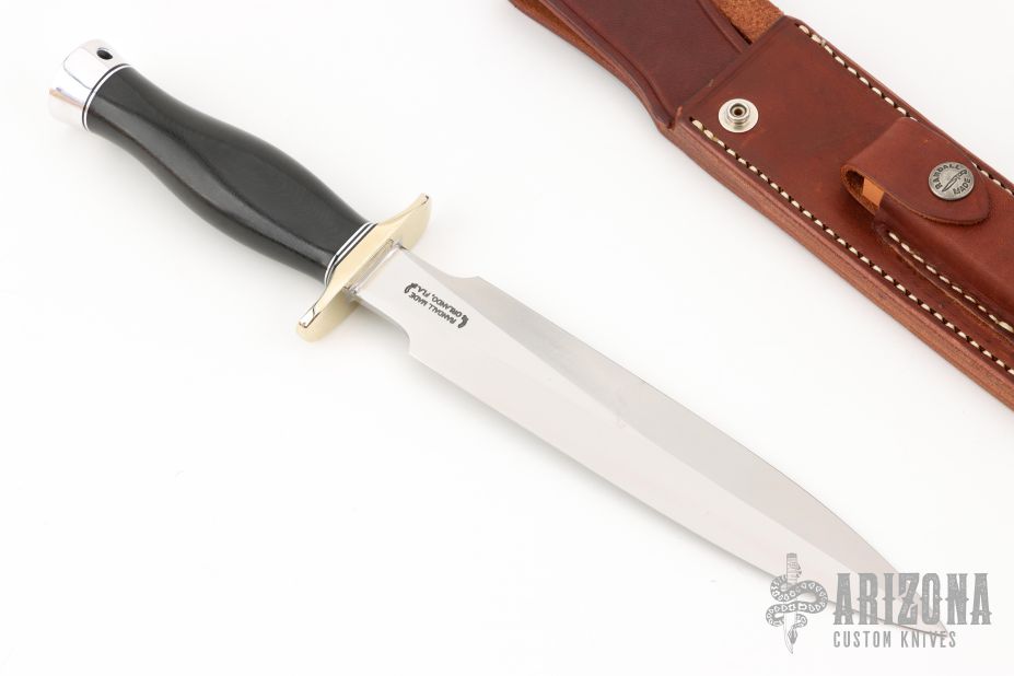 The Model 2-8 by Randall Made Knives is a heavily made dagger or dirk. The handle has a nickel silver guard and duralumin butt with lanyard hole, black linen micarta grip, black/duralumin spacers. Double-edged satin finished blade, .200" blade stock and 1.377" blade depth, hidden tang construction. Comes with a brown leather sheath, original paper wrapping and a zippered case. Excellent condition.