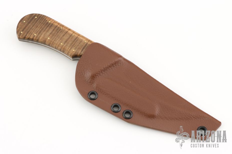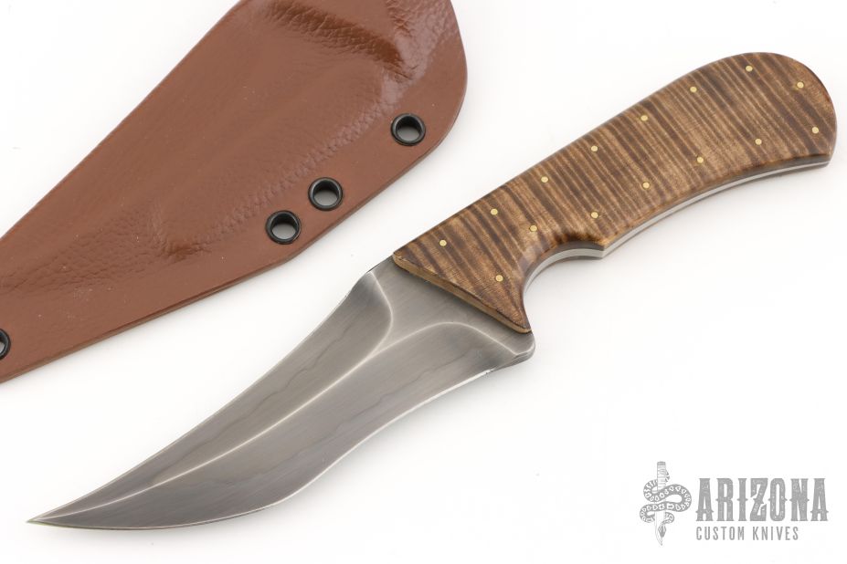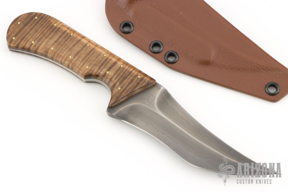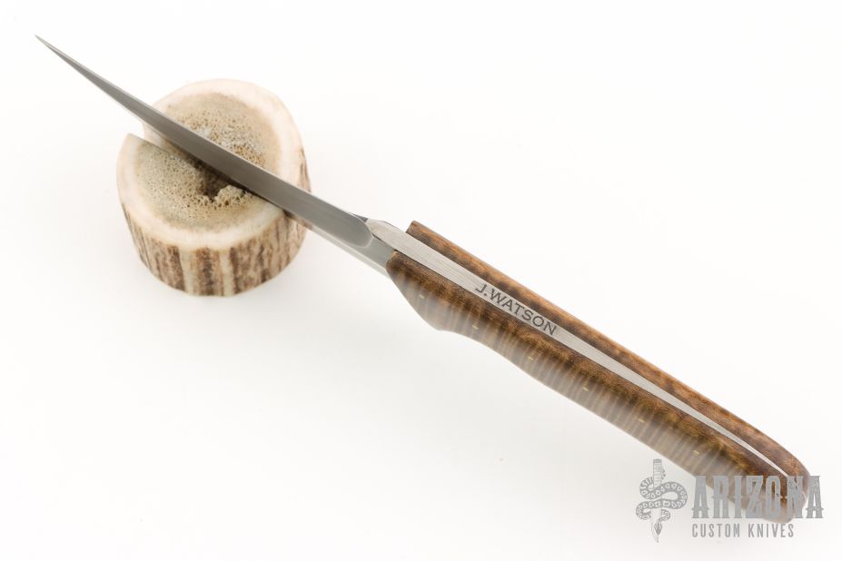 From the TAD GEAR website: The Watson TD TAD Edition is part of maker Joe Watson’s remembrance series. Named after members of Watson’s former units who were killed in action during ground combat operations supporting the War on Terror, these knives are made to honor the fallen. To create the TD, no CNC, mills, waterjet, laser or automated tools were used. All work was done in-house by Joe Watson himself, giving these blades a feel of being constructed during a different time in history. The knife is large-wheel hollow ground with a tapered tang to reduce weight. The handles are Curly Maple from Joe Watson’s private collection. Acquired over the length of his career, wood from this collection has a truly extraordinary figure, color and other characteristics which make them a step above the norm. Oftentimes these woods are once in a lifetime finds. For the TD, the Curly Maple was double hand dyed, sanded and sealed with over a dozen layers of Tru-oil finish for protection and a great look. They are secured via epoxy and a perimeter of small brass pins. The exclusive TAD Edition of this knife is constructed of W2 carbon steel with a clay hardened wave hamon, which was then triple tempered before being hand burnished and etched. **Unsharpened swedge can be easily sharpened** Features Clay Tempered W2 with Hamon blade, with an acute Persian blade profile Deep thumb ramp with jimping for precise control of the blade Contoured handles for improved edge awareness Curly Maple Handle Tapered Tang. Excellent condition.