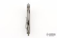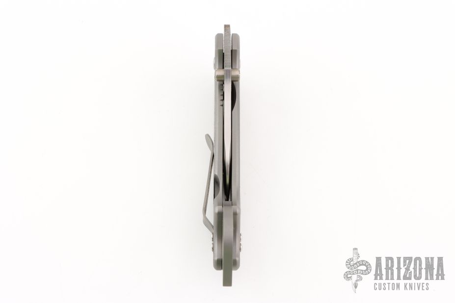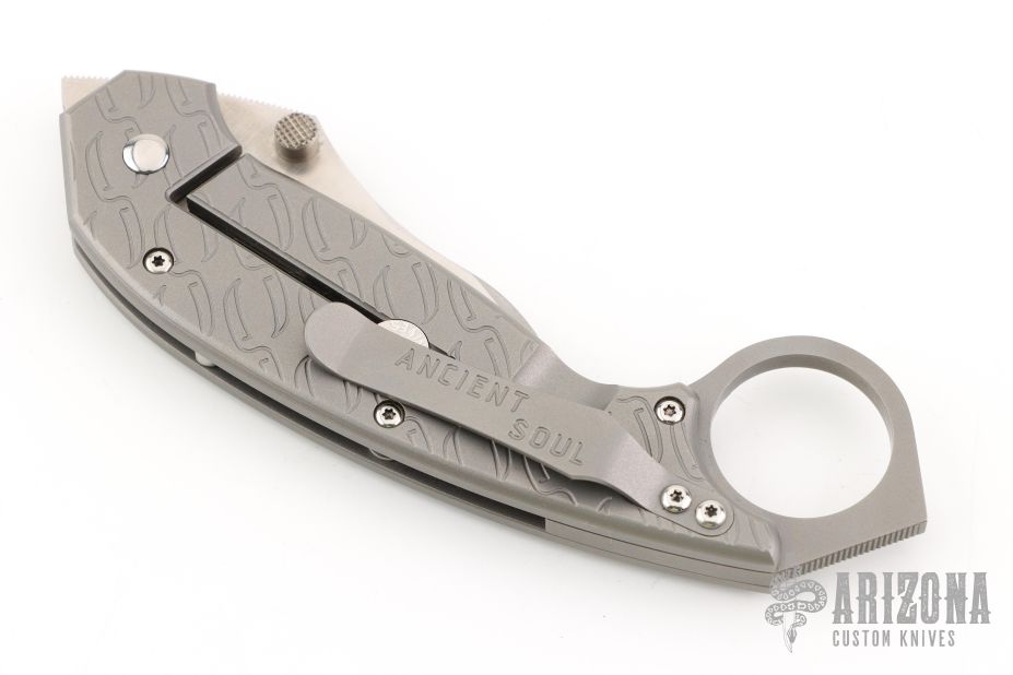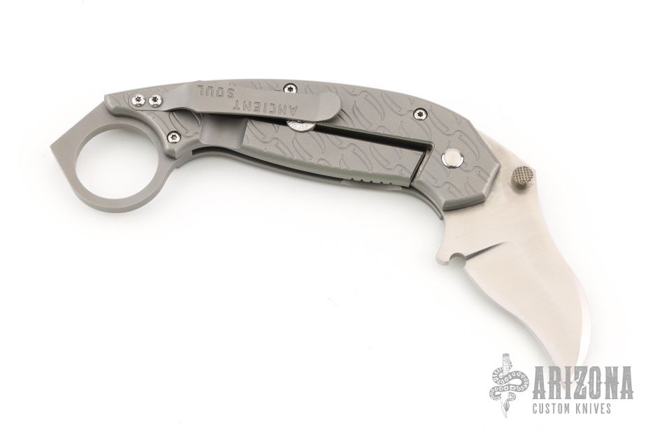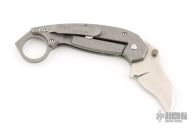 This Hinderer/Mah Collab Karambit Framelock has a hand ground satin finished blade with dual thumb studs and notched thumbrest. Handle is bead blasted titanium with matching tip up reversible clip. Dead center blade seating, perfect lockup, and smooth action. Engraved "2" on the ring. Comes with a zipper case. Has a couple very light scuffs, otherwise excellent condition. This is one of the prototypes with hand ground thumbrest.