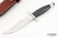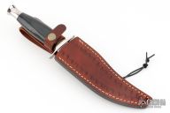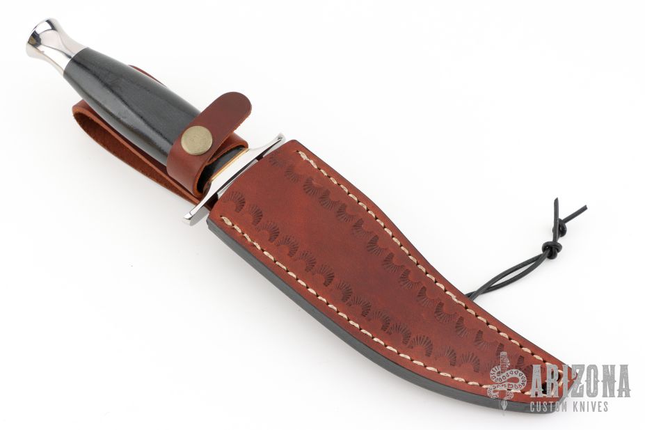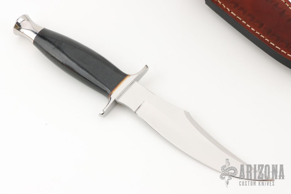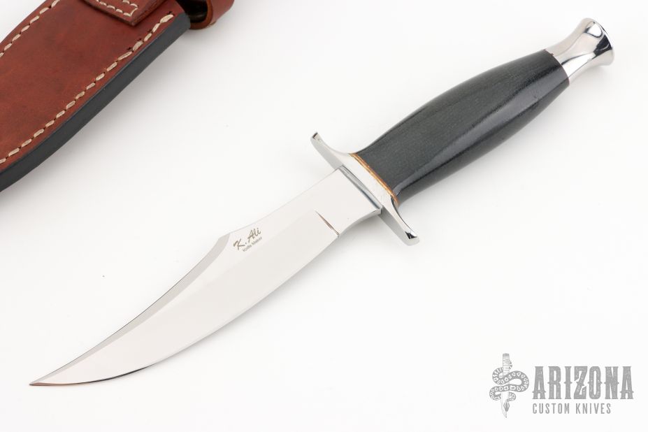This Little Bear Bowie by Forge Master K. Ali features a mirror finished clip point blade with false top edge, .166" blade stock and 1.348" blade depth, hidden tang construction. The handle has a stainless steel guard and butt, black canvas micarta grip with red and brass spacers. Comes with a hand tooled brown leather sheath, original box and COA. New from maker. Note: Has a couple of oxidation spots on the butt next to the micarta.