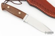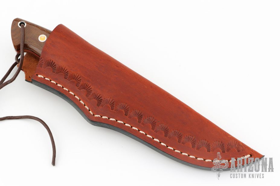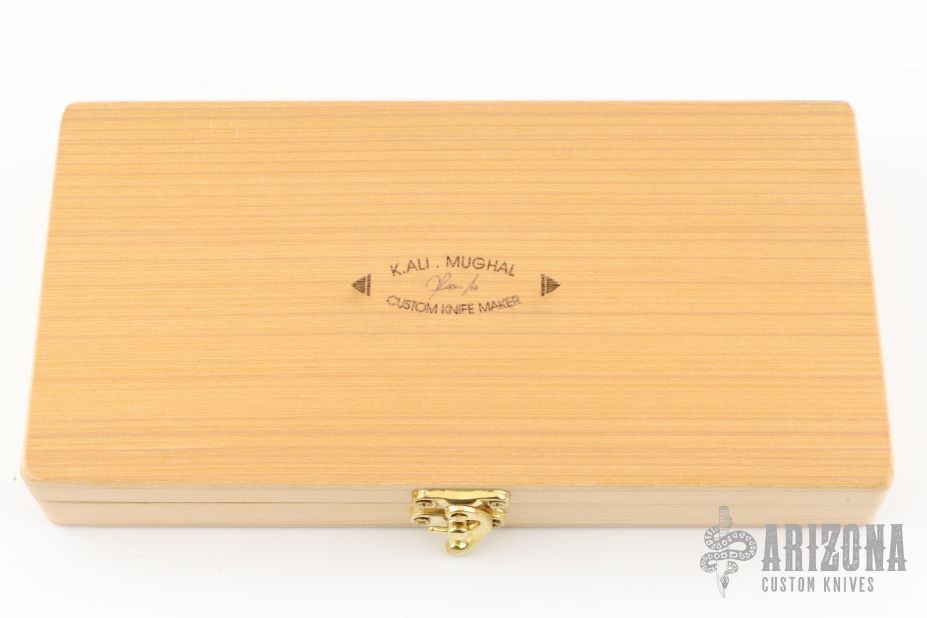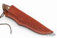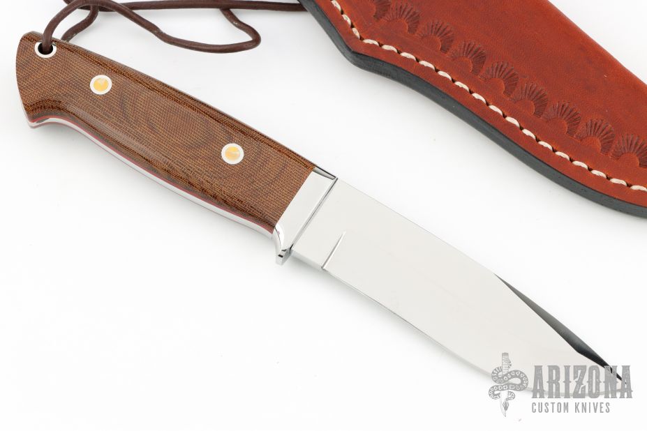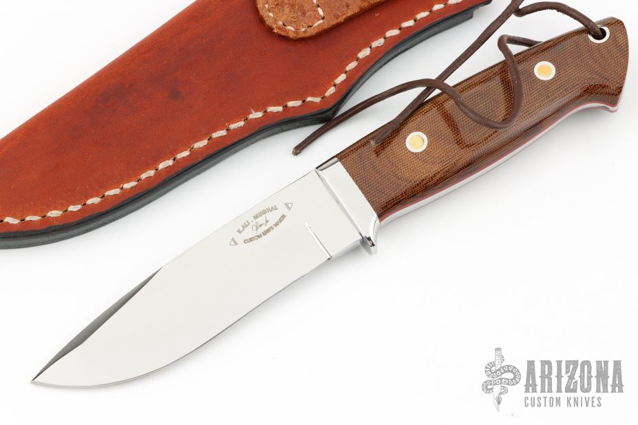 This Loveless Style Drop Point Hunter by Forge Master K. Ali features a mirror polished drop point blade with .190" blade stock and 1.048" blade depth, full tapered tang construction. The handle has a stainless steel guard with brown canvas micarta scales over red liners. Lanyard tube with leather lanyard in pommel. Includes COA, hand tooled brown leather sheath with belt loop and wooden presentation box. New from maker.