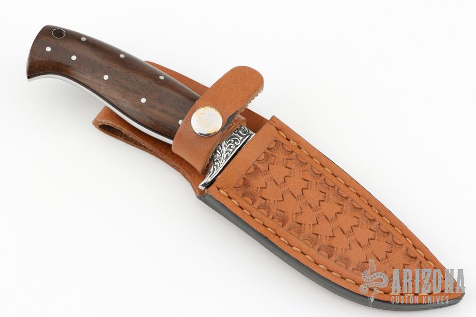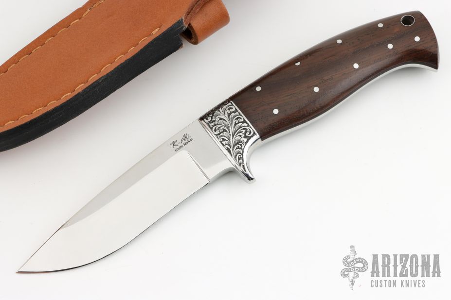 This Drop Point Hunter by Forge Master K. Ali features a mirror finished drop point blade, .208" blade stock and 1.086" blade depth, full tapered tang construction. The handle has an engraved stainless steel bolsters, rosewood scales with black liners, lanyard hole at the butt. Comes with a hand tooled brown leather sheath. Comes with original box. New from maker.