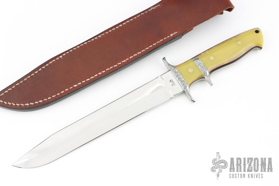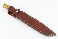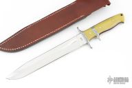 This Big Bear by Forge Master K. Ali features a mirror finished blade with sharpened top edge, .209" blade stock and 1.468" blade depth, full tapered tang construction. The handle has an engraved stainless steel bolsters, yellow G-10 scales with black and red liners, lanyard hole at the butt. Comes with a hand tooled brown leather sheath. Comes with original box. New from maker.