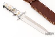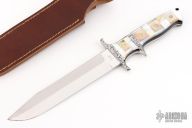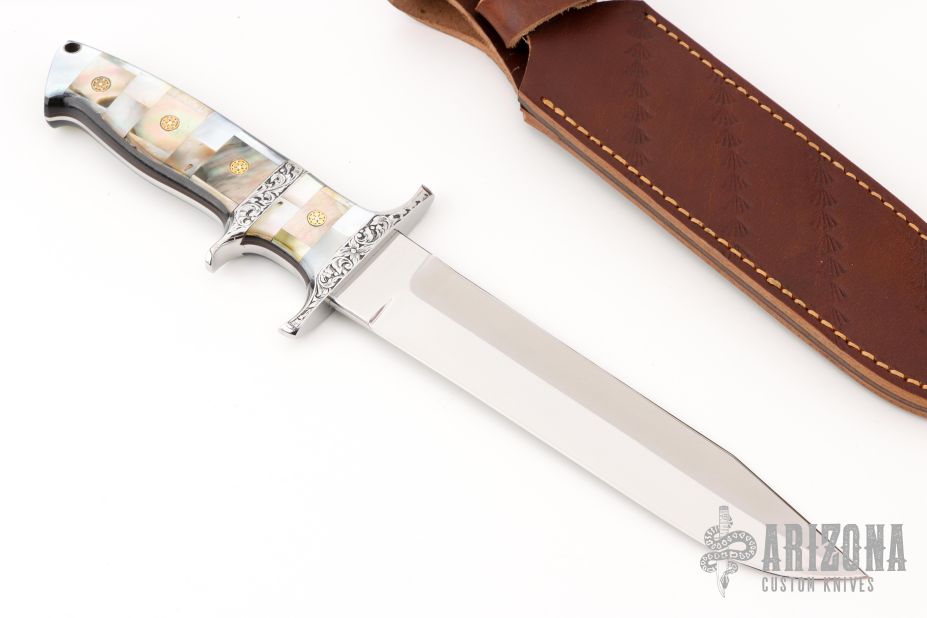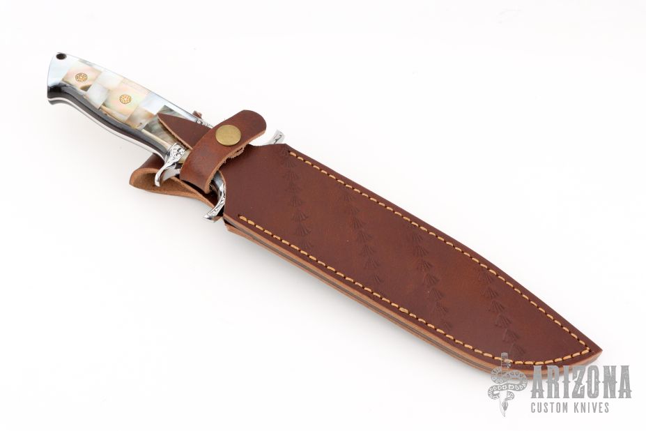 This Big Bear by Forge Master K. Ali features a mirror finished blade with sharpened top edge, .197" blade stock and 1.496" blade depth, full tapered tang construction. The handle has an engraved stainless steel guard and sub-hilt, mosaic pearl scales with black liners, lanyard hole at the butt. Comes with a hand tooled brown leather sheath. Comes with original box. New from maker.