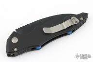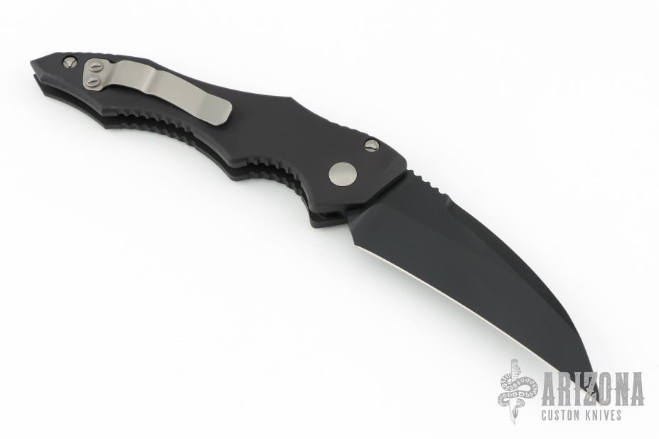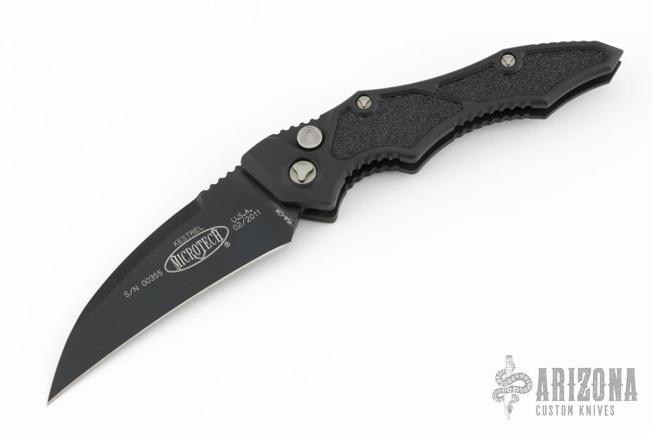 This Kestrel Auto from Microtech has a black coated 154-CM stainless steel hawk-bill plain edge blade. The handle is black aluminum with non-slip inserts, stainless steel tip up clip, and blue standoffs. Dated 02/2011 and s/n 00355. Includes a nylon sheath, original box and papers.  Excellent Condition.