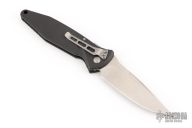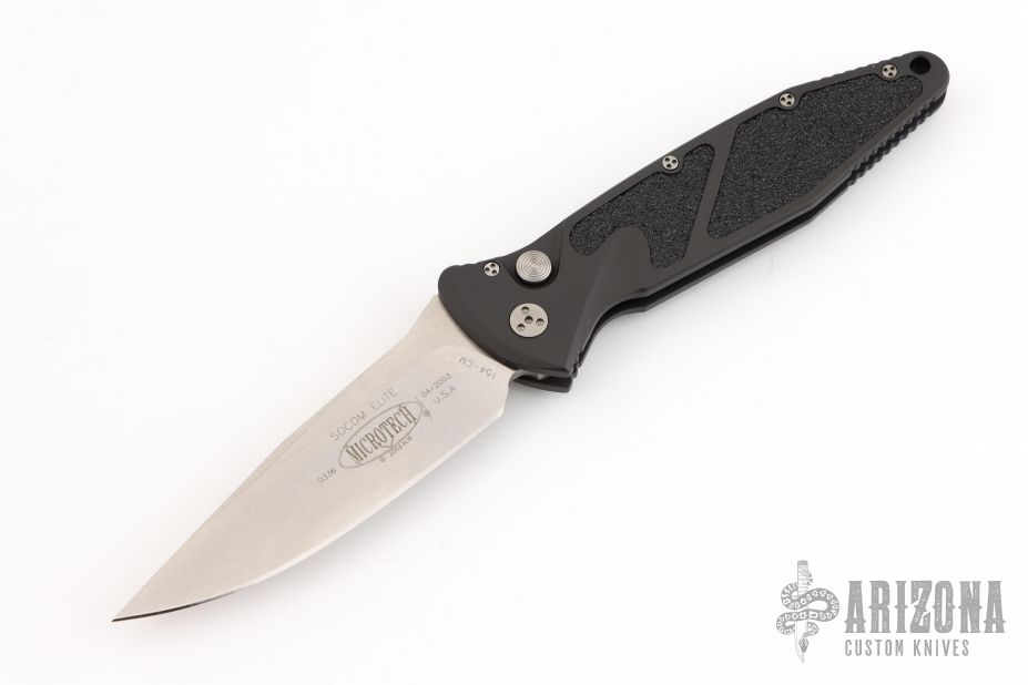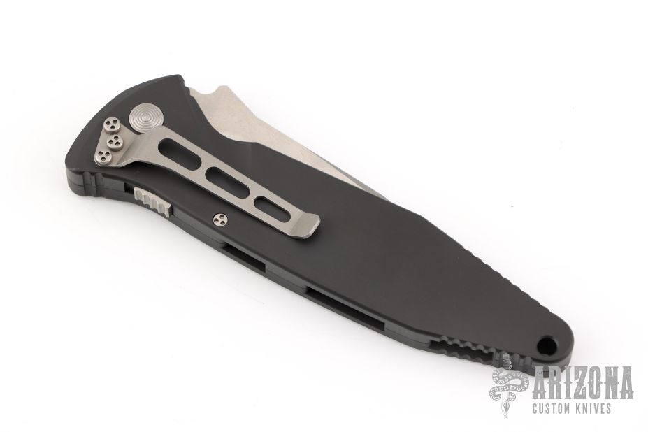 This Mini Socom Elite automatic folder by Microtech Knives has a satin blade with a notched thumb ramp. The handle has a black aluminum frame with non-slip inlays, stainless steel clip positioned for tip down carry, and lanyard hole at the pommel. Has saftey. Serial number #0336 and dated 04/2003. Includes original tube and papers. Excellent Condition.