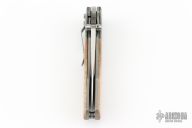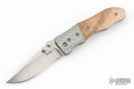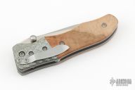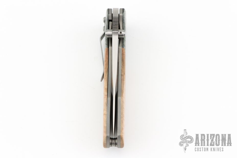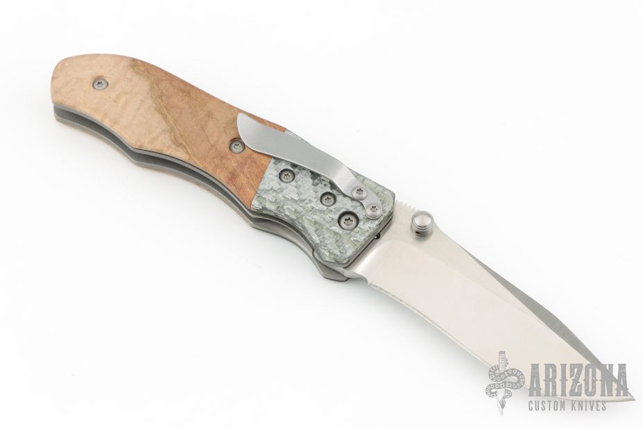 This Flare by Kirby Lambert features satin finished recurve blade with swedge, dual thumbstuds and notched thumbrest. This knife features silver Twill carbon fiber bolsters, wood scales, bead blasted titanium liners, titanium barrel spacers, and a stainless steel clip positioned for tip-down carry. Nice detent, lockup and blade seating.  Includes a padded veclro case. Excellent condition.