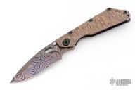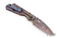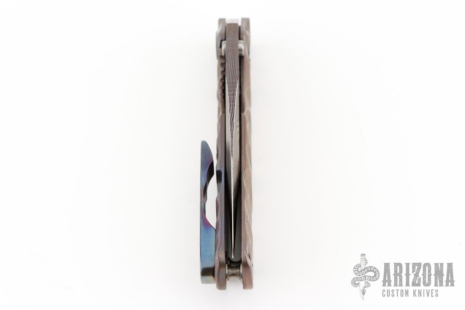 This Marissa Strider custom SNG framelock folder features a Cobalt Damascus hand ground blade with notched thumbrest and a thumbhole. The handle has a Sole Authorship Damascus and anodized and orange peel finished titanium frame with a matching Damascus tip up clip. Includes Hinderer "Lock Bar Stabilizer" for maximum reverse lock retention. Nice lockup, blade seating and detent. Comes with a zippered case. Excellent condition.