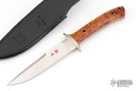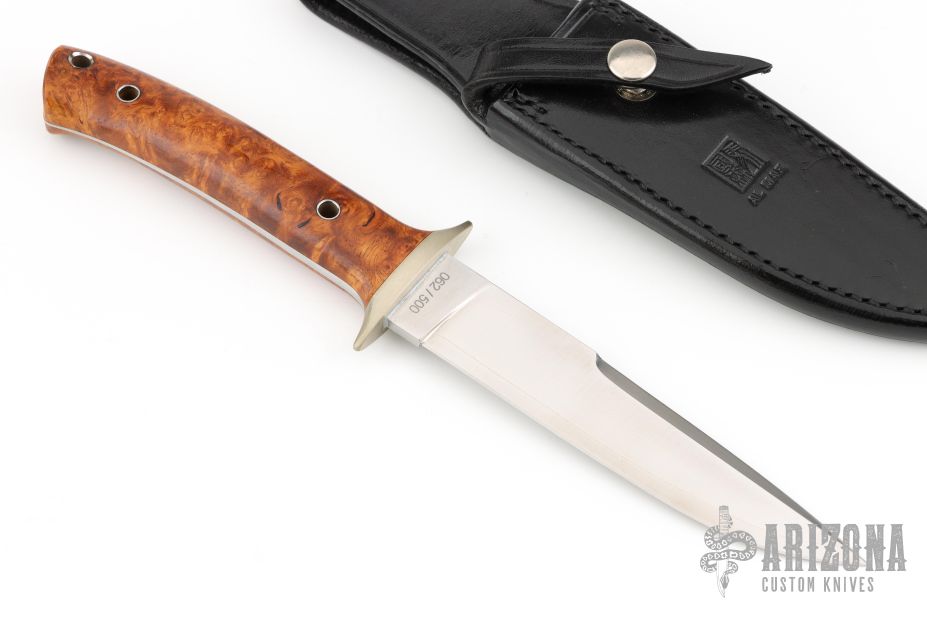 Shiva is the first tactical fixed blade Al Mar made with a laminated VG-10 stainless steel blade. Laminating the VG-10 between two layers of 400 series stainless steel increases the lateral strength of the blade by upwards of 30% and does so without increasing the weight or bulk. The Shiva has a beautiful tapered tang, contoured and wood scales, nickel silver guard and a full grain traditional black leather sheath. Excellent condition. Numbered 062/500 on ricasso.