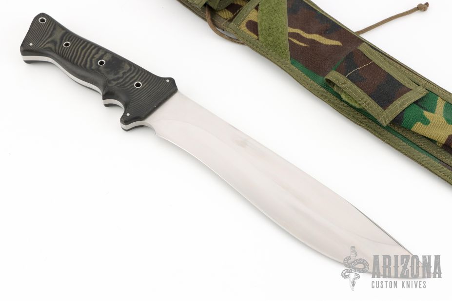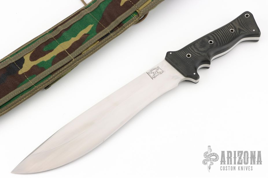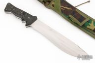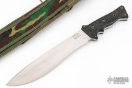 This Bush Hog by Walter Brend features a hand rub satin finished blade with false top edge, .250" blade thickness and 2.030" blade depth, full tang construction. The handle features black linen micarta scales. Includes a camo nylon sheath. Has a couple light scratches, otherwise excellent condition.  #014 on blade spine