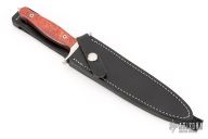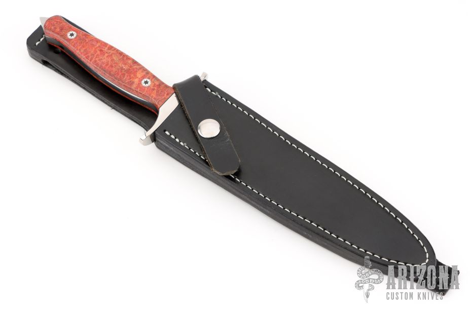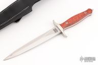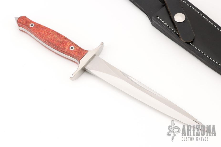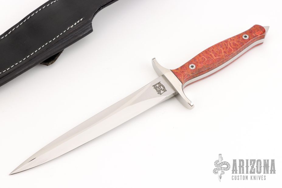 This dagger by Walter Brend features a mirror finished double edged blade, .251" blade thickness and .976" blade depth, full tang construction. The handle has a mirror finished stainless steel guard, tiger coral scales with black liners, and a skull crusher. Beautiful grinds that are a trademark of Walter Brend. Nicely contoured handle, feels great in the hand. Mosaic pins. Unmatched workmanship a true collector's piece. Comes with a black leather sheath made by Jamey Taylor leather works. Excellent condition. Comes with a zippered case.