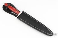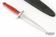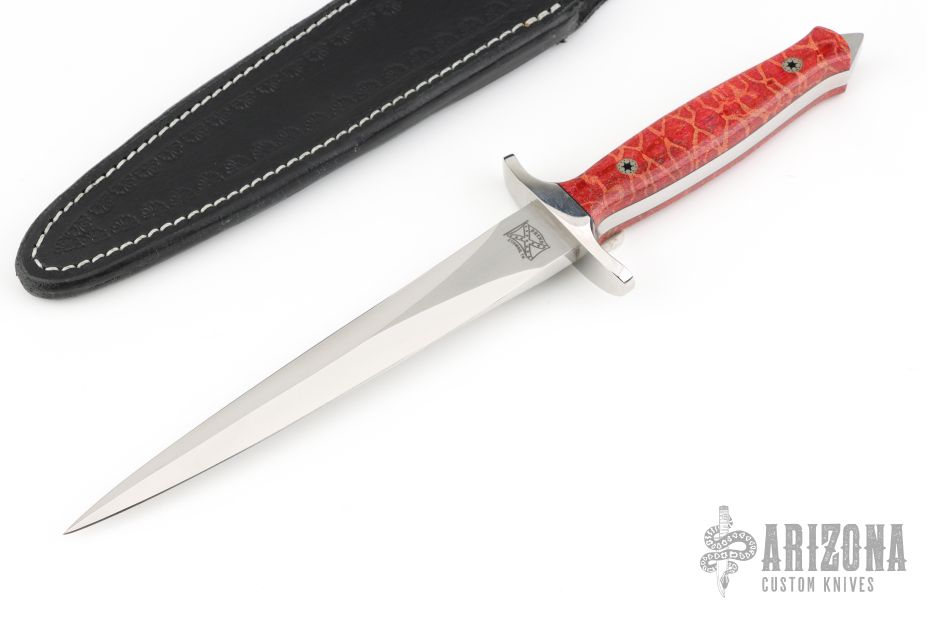 This dagger by Walter Brend features a mirror finished double edged blade, .275" blade thickness and .928" blade depth, full tang construction. The handle has a mirror finished stainless steel guard, tiger coral scales with black liners, and a skull crusher. Beautiful grinds that are a trademark of Walter Brend. Nicely contoured handle, feels great in the hand. Mosaic pins. Unmatched workmanship a true collector's piece. Comes with a hand tooled black leather sheath. Excellent condition.