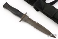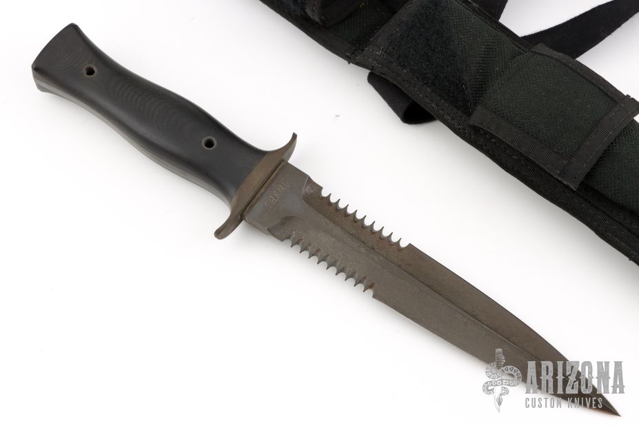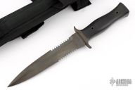 This rare Brend dagger features a double edged blade with partially serrated edges and black oxide finished, .258" blade stock and 1.264" blade depth, full tapered tang construction. The handle has black oxide finished stainless steel guard with black linen micarta scales. Comes with a nylon sheath and a zippered case. Has a couple light scuffs, otherwise excellent condition.