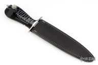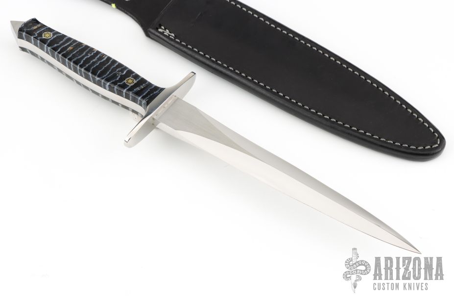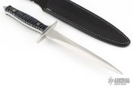 This dagger by Walter Brend features a mirror finished double edged blade, .274" blade thickness and .953" blade depth, full tang construction. The handle has a mirror finished stainless steel guard, mammoth tooth scales with black liners, and a skull crusher. Beautiful grinds that are a trademark of Walter Brend. Nicely contoured handle, feels great in the hand. Mosaic pins. Unmatched workmanship a true collector's piece. Comes with a black leather sheath. Excellent condition.