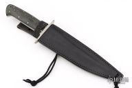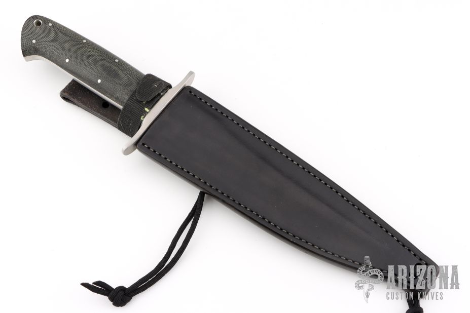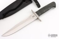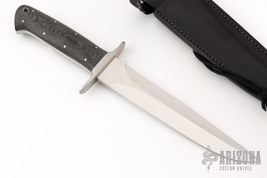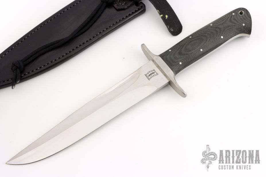 This Model 1-8 by Walter Brend features a double hollow ground blade with hand rub satin finished flats and satin polished grinds, and a 4" sharpened top edge, .277" blade stock and 1.412" blade depth, full tang construction. The handle has a satin finished titanium double guard, and black canvas micarta scales, hollow tube pins and lanyard hole. Comes with a black leather sheath. Excellent condition.