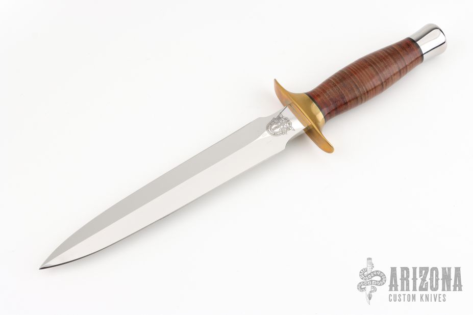This dagger by Walter Brend features a mirror polished double edged blade, .242" blade stock and 1.272" blade depth, hidden tang construction. The handle has a brass guard and stainless steel butt with a stacked leather grip and black silver spacers. Comes with a wooden presentation case and a picture of Walter Brend presenting this knife and case to General Harold Moore. He was originally presented with a wooden plaque for his three terms in Vietnam. He said that the dagger that came with the plaque was cheap and ugly and he asked Walter to make him one to go in its place. Walter agreed. This information is courtesy of the man himself, Walter Brend. Excellent condition. #001 on the blade. Walter said he made less than 10 of them.