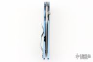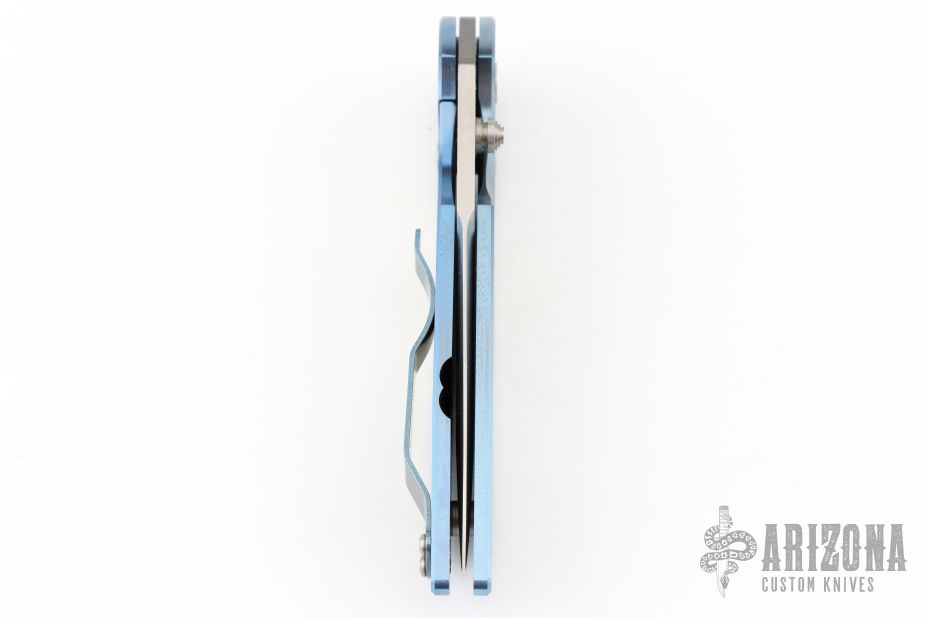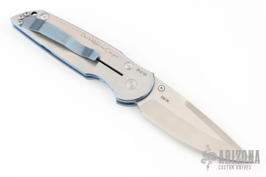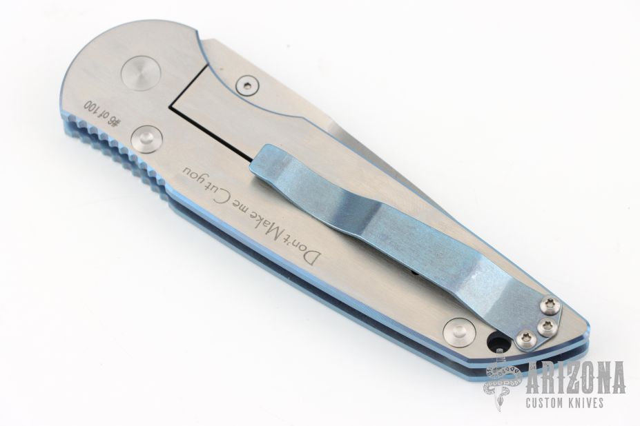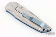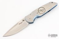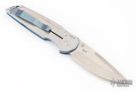 This vintage TR-3 manual Jersey Devil model features a solid titanium frame with blue edges and satin flats. Custom lasered engraved Jersey Devil logo. Stonewash/satin finished CPM-S35VN stainless steel blade. Blue pocket clip for tip up carry. Numbered #6 of 100. Old style green box with nylon sheath.  Has a couple of light scratches otherwise the knife is in excellent condition.