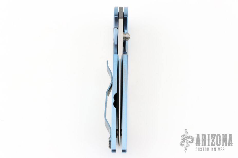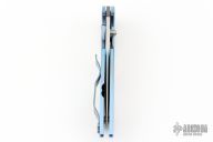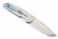 This vintage TR-3 manual Jersey Devil model features a solid titanium frame with blue edges and satin flats. Custom lasered engraved Jersey Devil logo. Stonewash/satin finished CPM-S35VN stainless steel blade. Blue pocket clip for tip up carry. Numbered #97 of 100. Old style green box with nylon sheath.  Has a couple of light scratches otherwise the knife is in excellent condition.