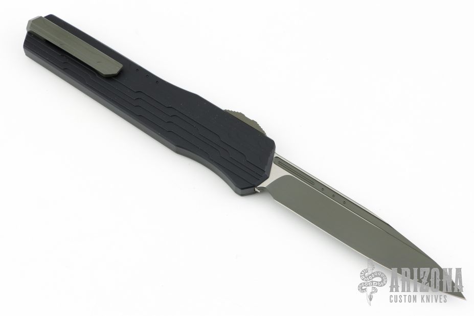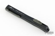 This Cypher OTF is a collaboration between Anthony Marfione and DC Monroe. It features a green standard blade with satin flats and notched thumbrest. The handle has a black anodized aluminum handle with all green hardware and titanium tip down clip. Comes with original box and papers. Excellent condition. 12/2017 and #077.