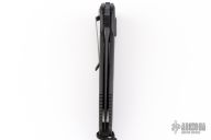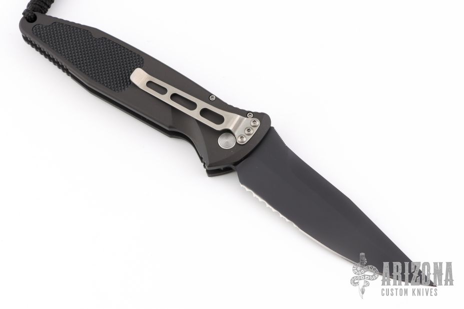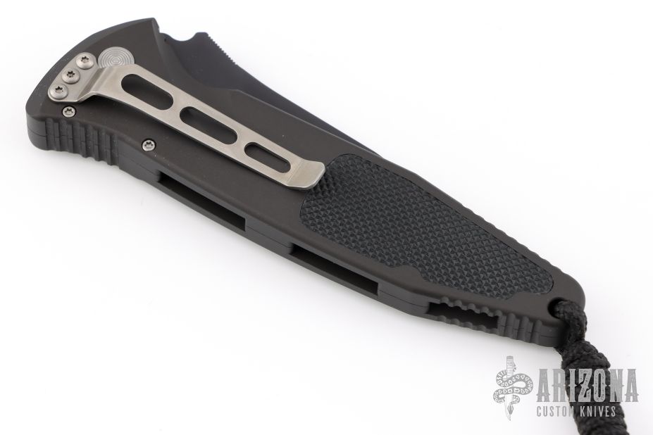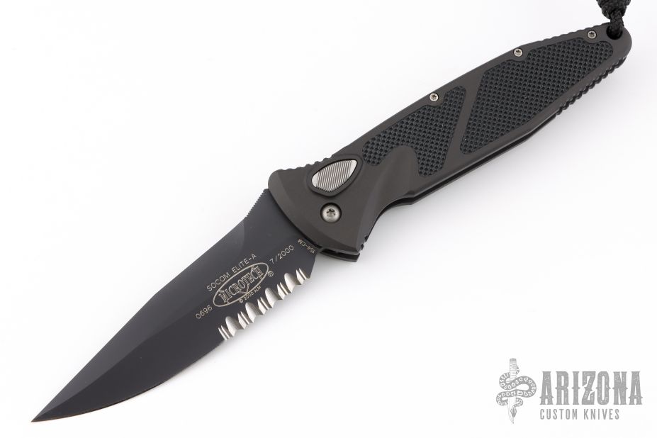 This Socom Elite automatic folder by Microtech Knives has a black blade with partial serrations and notched thumb ramp. The handle has a black aluminum with non-slip inlays, stainless steel clip positioned for tip down carry, and lanyard hole at the pommel. Includes original box, sheath and papers. Serial number 0696 and dated 07/2000. Excellent Condition.