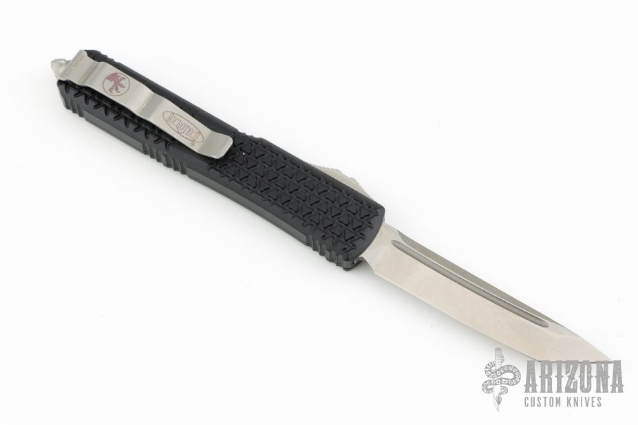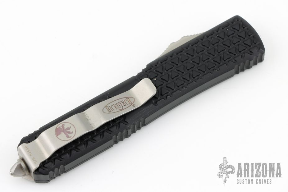 This Ultratech OTF automatic features a T/E stonewashed tanto blade with a standard edge. Black aluminum tri-grip frame with stainless steel clip. Glass breaker. Serial number 64548and dated 03/2016. Comes with original bo and papers, has a couple light scratches, otherwise excellent condition.