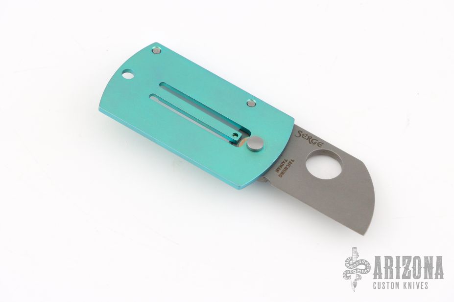 The aptly named Dog Tag Folder from Spyderco is based on Serge Panchenko's custom dog tag sized knife. The miniature, convenient size of the Dog Tag Folder is complemented with a lightweight anodized titanium handle that uses a slip joint type mechanism. The CPM-S30V steel blade is chisel ground and sports the Spyderco hole opener. Comes with original box and papers. Has some scuffs and scratches, great condition otherwise.