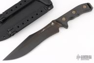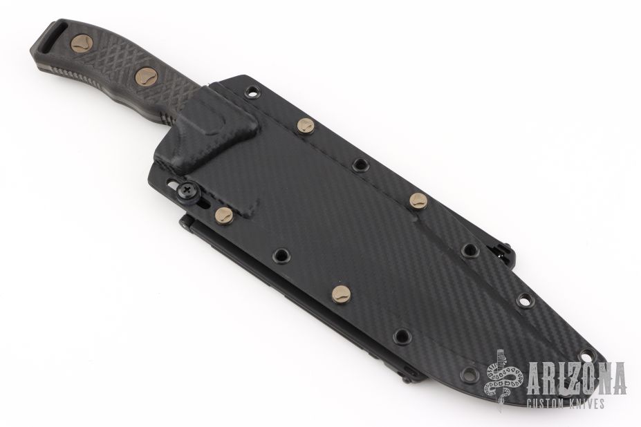 This Arbiter by Microtech features a two-tone DLC recurve partially serrated blade with a notched thumbrest and sharpened top edge. The handle has carbon fiber scales with bronzed hardware, .213" blade thickness and 1.879" blade depth, full tang construction. But has a lanyard hole. Comes with kydex sheath with MOLLE locks. Comes with original box and papers. Serial number 367 and dated 09/2024. Excellent condition.