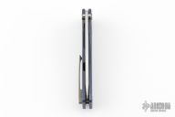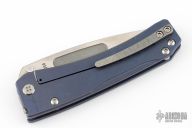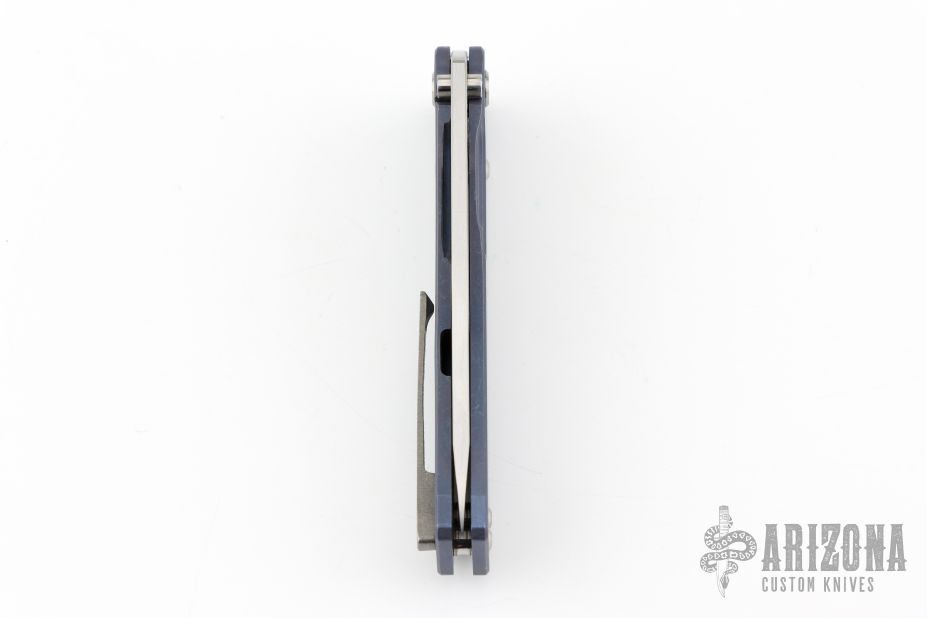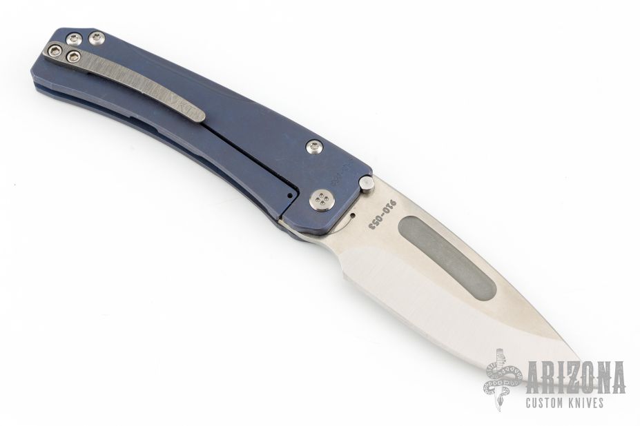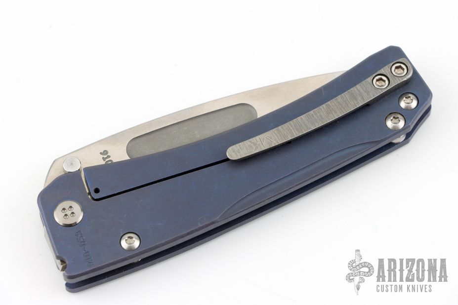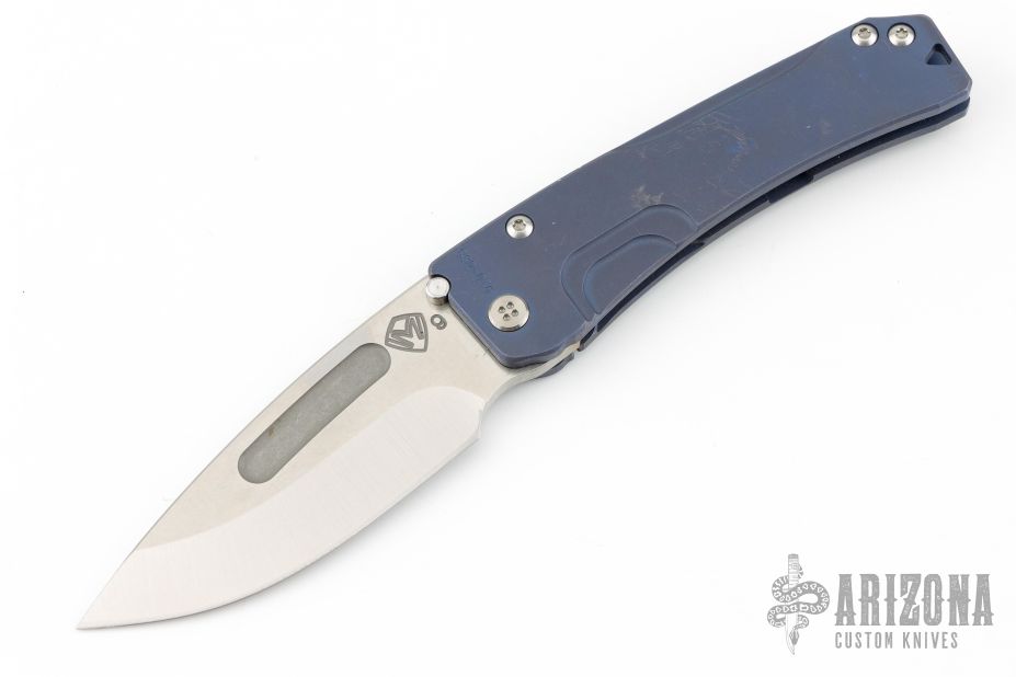 This Slim Midi Marauder from Medford Knife and Tool features a stonewashed drop point blade with thumb stud and recess. The handle has a milled titanium frame with tip up clip over a satin finished stainless steel spacers. Nice detent, lockup, and seating. Has a few light scuffs, otherwise excellent condition