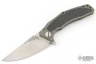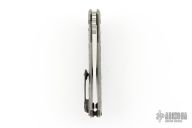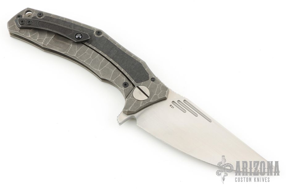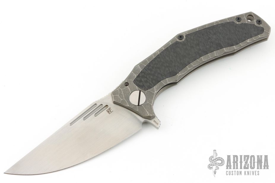 This Morrf-5 by Custom Knife Factory features an upswept hand rub satin finished blade with notched thumbrest and flipper. The handle has a stonewashed and rock textured titanium frame with carbon fiber insets and with matching tip up clip, lanyard hole and black barrel spacers. Nice detent, lockup and blade seating. #21. Comes with original Velcro case, and COA. Has a couple light scuffs, otherwise Excellent condition.