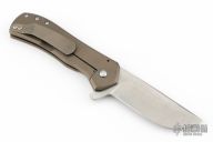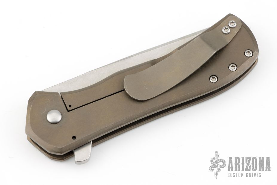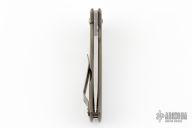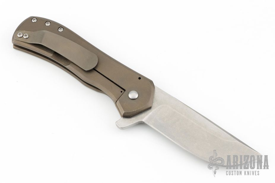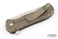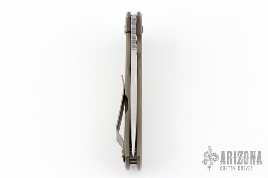 This Recon flipper by Doc Shiffer features a tumbled blade with notched thumbrest and a flipper. The handle has an anodized and tumbled titanium frame and pocket clip is positioned for tip up carry. Nice blade seating, detent and lockup. Excellent condition.