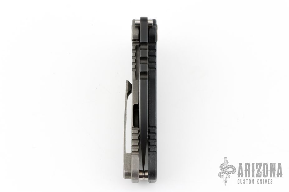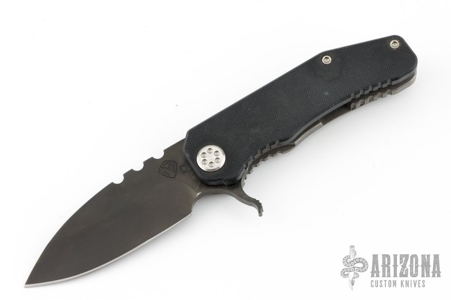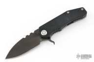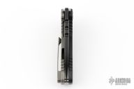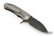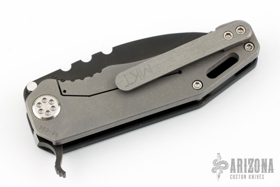 This 187F by Medford Knife and Tool features a gray PVD coated blade with notched thumbrest and flipper. The handle has a tumbled titanium lockside with black G10 scale and tip up titanium clip. Nice detent, lockup and blade seating. Excellent condition.
