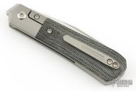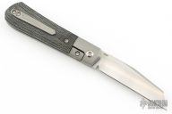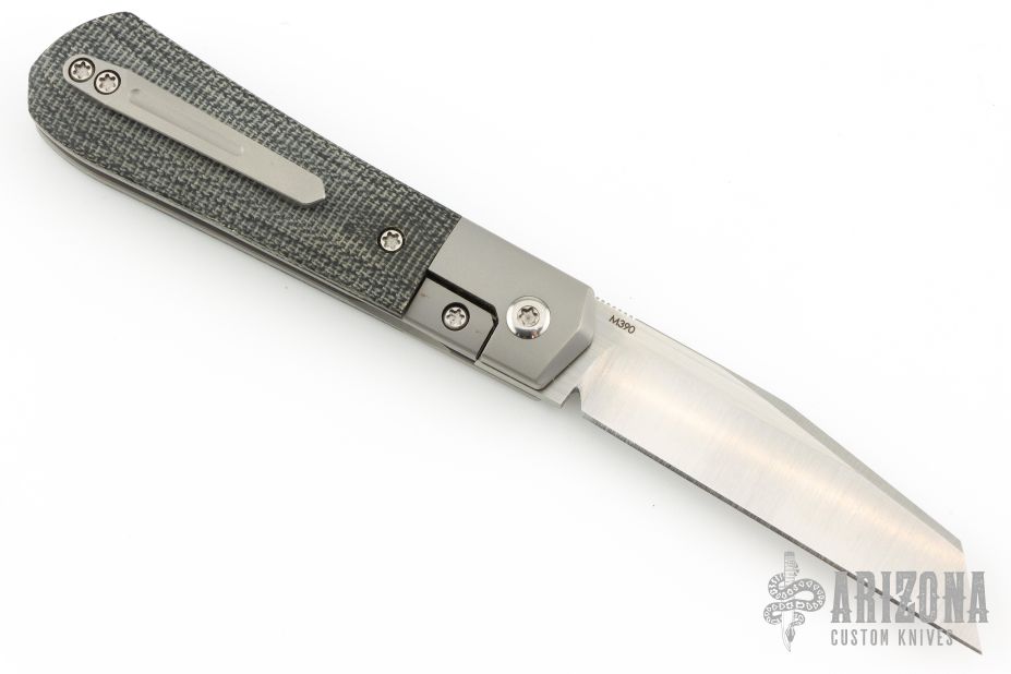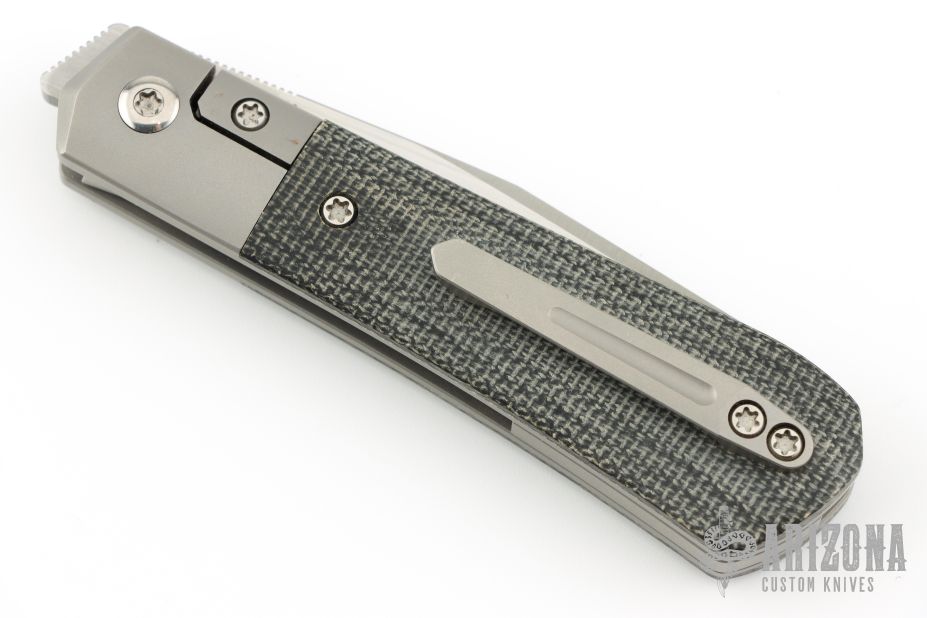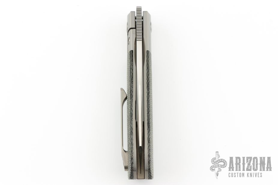 This Apache Front Flipper by Enrique Pena features a satin finished blade with a front flipper and notched thumbrest. The handle has titanium bolsters, black micarta scales with a titanium backspacer and matching tip up pocket clip. Includes a Pena X-Series padded box. Has a couple light scuffs and scratches, otherwise Excellent condition.