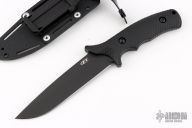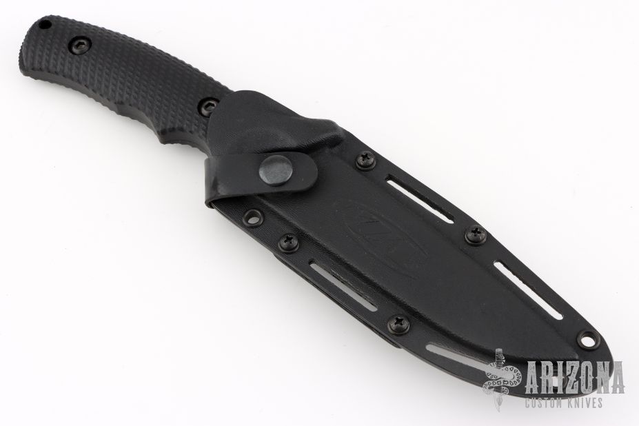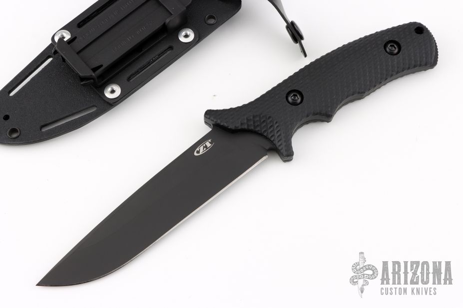 This ZT 0170 features a black blade with false top edge and a notched thumbrest, .170" blade stock and 1.391" blade depth, full tang construction with black G-10 scales. Comes with a black kydex sheath. #2430. Has a couple light sheath marks on the blade, excellent condition otherwise. Comes with original box and papers.