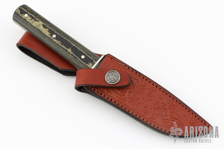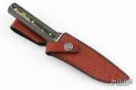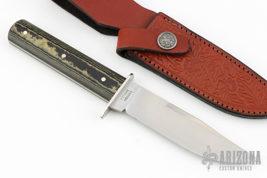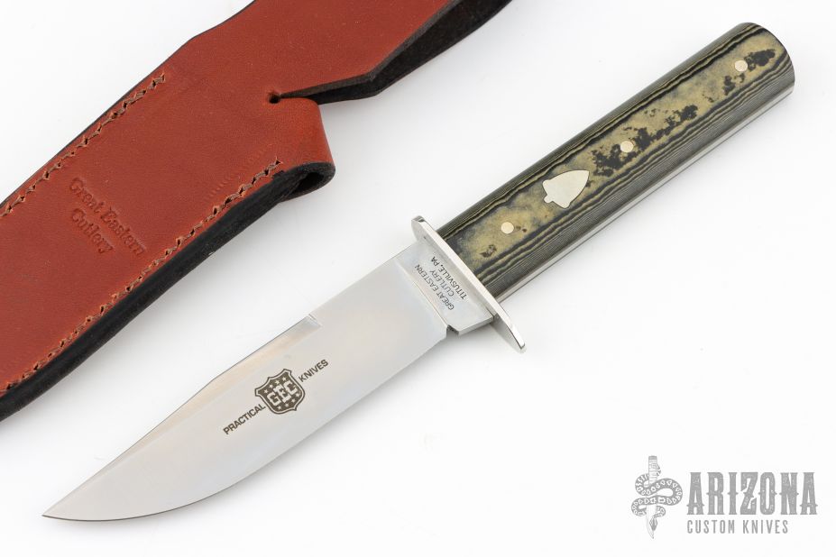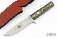 This knife by Great Eastern Cutlery features a satin finished blade with false top edge, .087" blade stock and .899" blade depth, full tang construction. The handle has a nickel silver guard and daybreak camo scales and a nickel silver escutcheon. Comes with a brown leather sheath and original packaging. Excellent condition.