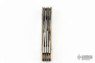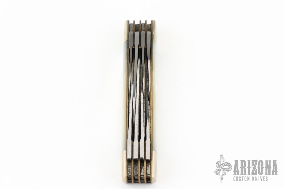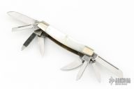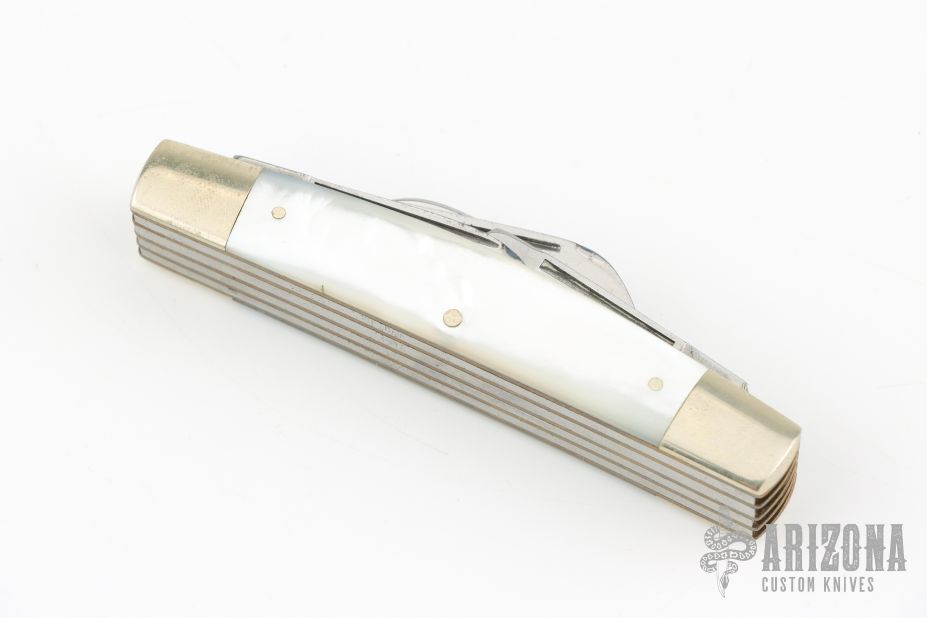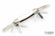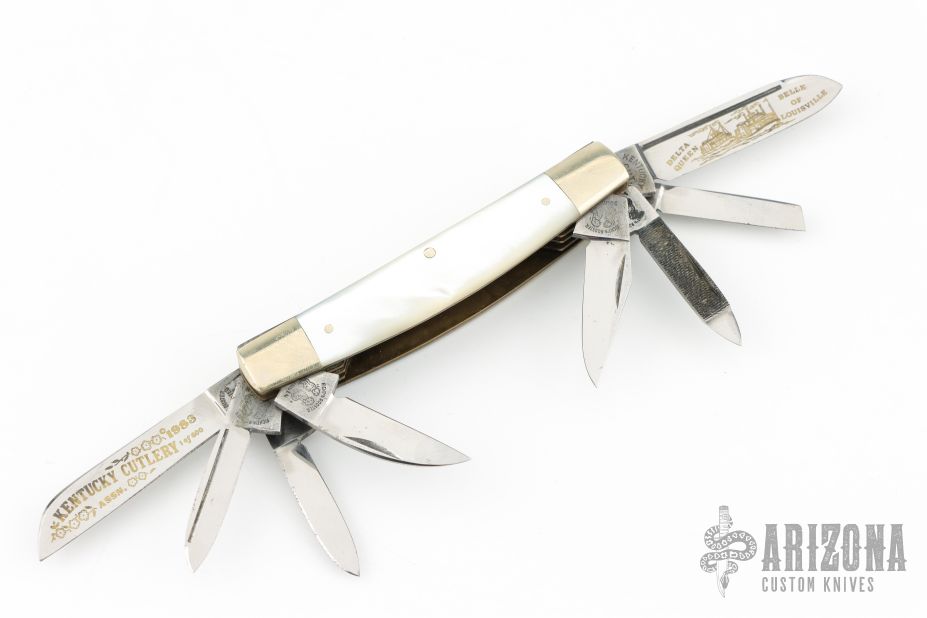 This slipjoint from Fight'n Rooster Knives features eight polished blades with nail nicks. The handle has nickel silver bolsters and pearl covers with nickel silver escutcheon, brass liners and steel backsprings. Has a couple light scratches, excellent condition otherwise.