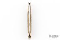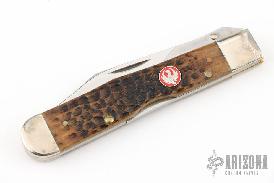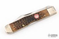 This Cheetah lock back folder from Case Knives features a clip point mirror polished blade with nail nick. The handle has nickel silver bolsters, front and rear, and swing guard, and the scales are jigged bone over brass liners. Comes with original box, leather case and papers. Has some patina on the bolsters, otherwise excellent condition.