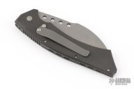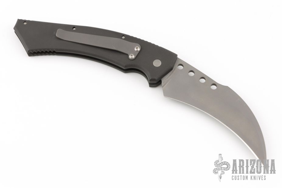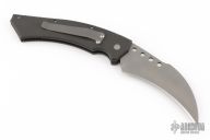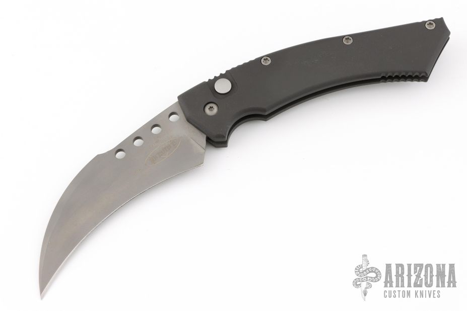 This Hawk Auto from Microtech has a bead blasted hawkbill blade. Handle is black anodized aluminum with bead blasted titanium tip down clip. Action is quick and strong. Dated 9/96. Comes with original box and papers. Excellent condition.