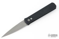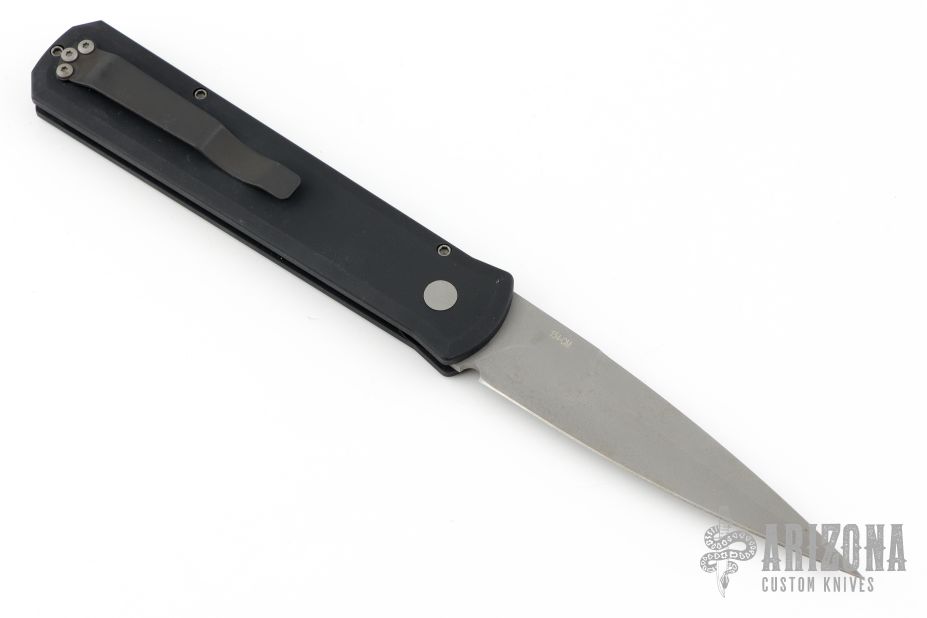 This Godfather by Pro-Tech features a bead blasted blade with notched thumbrest. The handle has a black aluminum frame with bead blasted hardware and black stainless steel tip up clip. Has a couple light scuffs, otherwise excellent condition. Comes with original box.